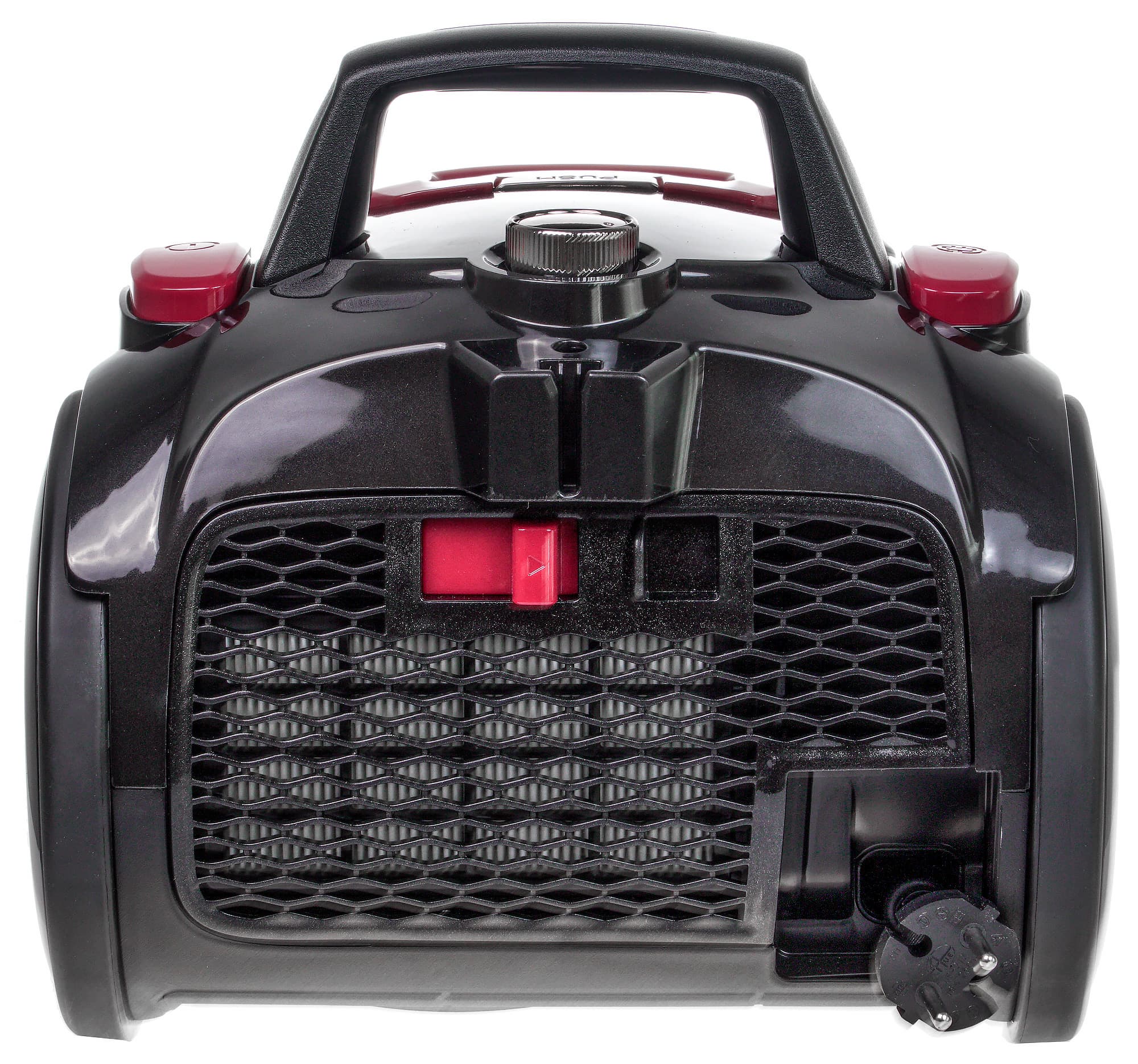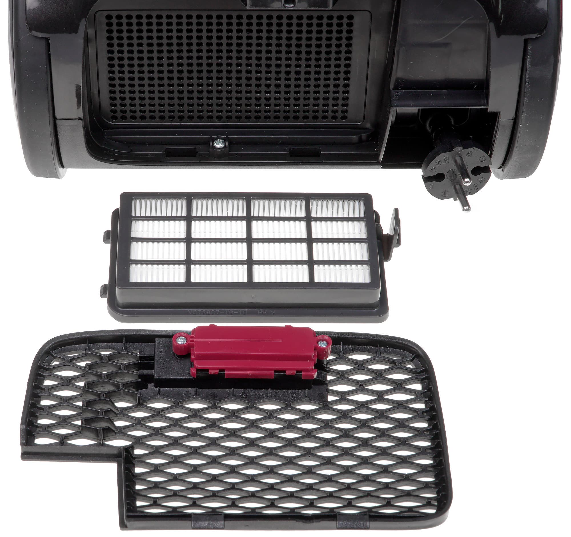 Прошедший входную фильтрацию и крыльчатку мотора воздушный поток покидает пылесос через третий фильтр, расположенный в задней части устройства. Решетчатая крышка отсека с прямоугольным выпускным HEPA-фильтром занимает здесь большую часть панели корпуса. Фиксируется она защелкой ярко-красного цвета.