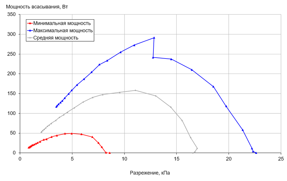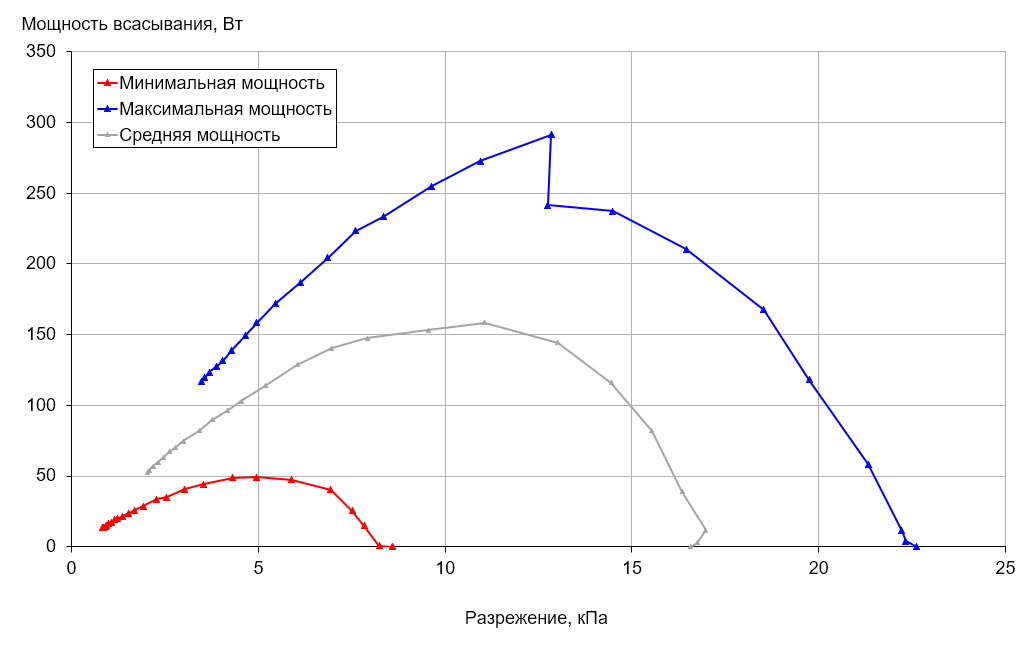 Мощность всасывания (что это такое и как мы ее измеряем, описано в отдельной статье) мы определяли при работе пылесоса без трубы и насадок. Зависимость мощности всасывания от создаваемого разрежения приведена на графике ниже: