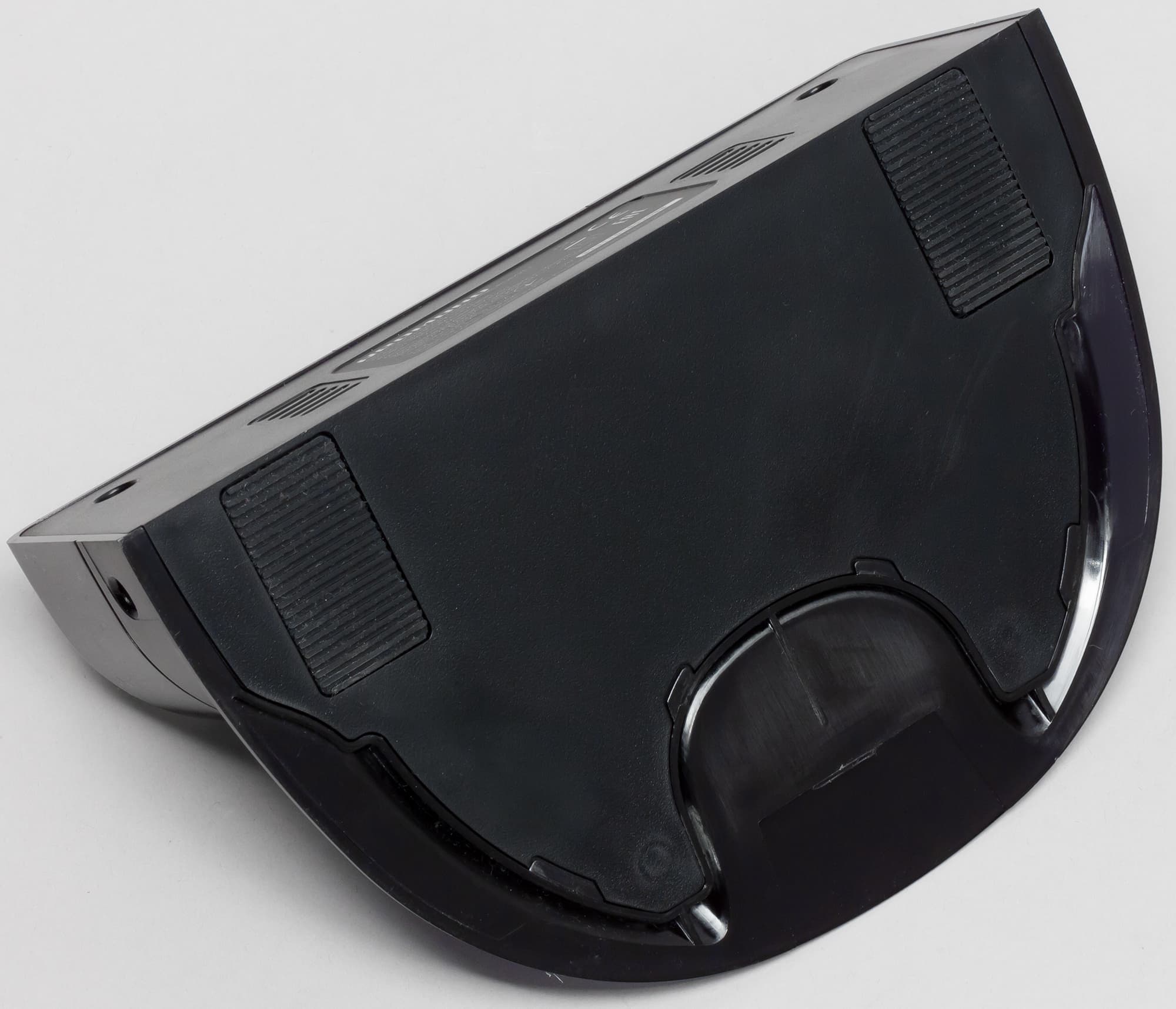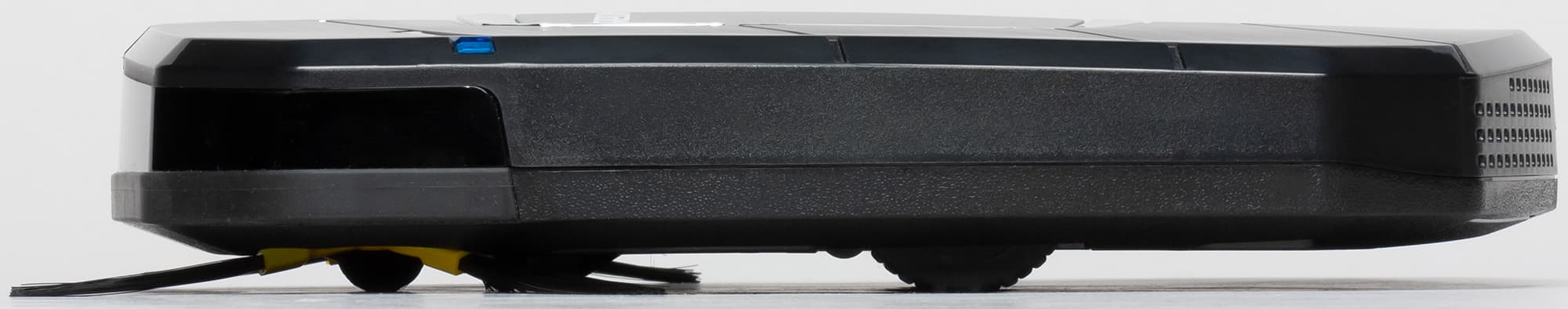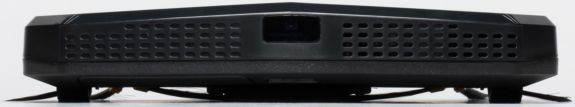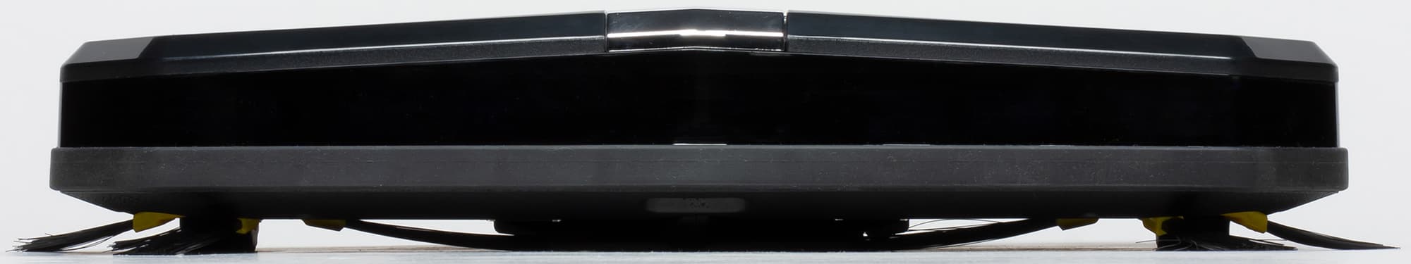 Края снизу скошены, что помогает роботу преодолевать препятствия. Небольшой скос сверху наоборот повышает вероятность того, что пылесос будет застревать под препятствиями с небольшим просветом от пола, чему способствует отсутствие механического бампера.