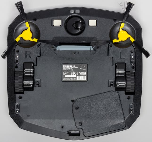 В передней части и по бокам близко к краю расположены пять ИК-датчиков перепада высоты, благодаря которым пылесос может избежать падения со ступенек. Диапазон вертикального перемещения ведущих колес составляет порядка 14 мм, а диаметр колес равен 45 мм. На ведущих колесах есть резиновые покрышки с грунтозацепами. Ведущие колеса и боковые щеточки рукой не проворачиваются, это может осложнить извлечение робота из-под низких предметов обстановки, под которыми он плотно застрянет, и чистку щеточек.