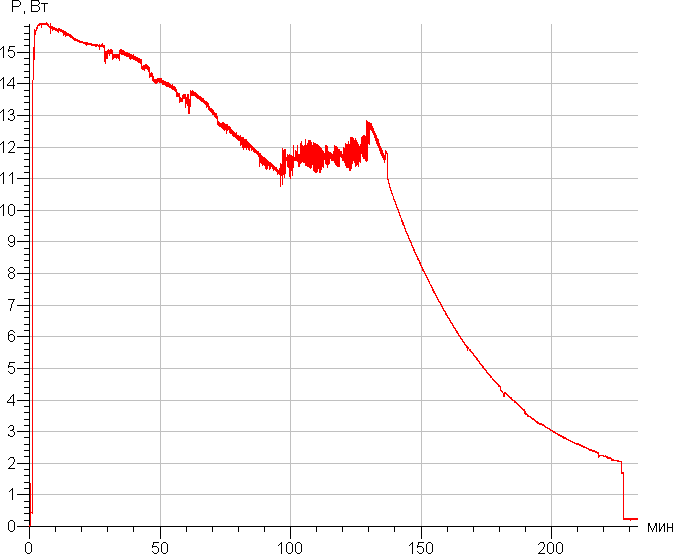 Без подзарядки робот может убирать примерно 1 ч 50 мин. На восстановление заряда роботу требуется 3 ч 50 мин. График потребления от сети: