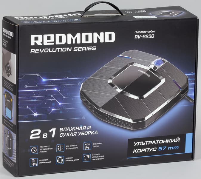 Робот-пылесос Redmond RV-R250 упакован в небольшую красочно оформленную коробку из гофрокартона. На внешних плоскостях коробки есть изображения самого робота, а также перечислены его основные особенности и характеристики. Надписи преимущественно на русском языке. Для защиты и распределения содержимого применяются формы из пенопласта и пластиковые пакеты. Коробка оснащена пластиковой ручкой, поэтому донести покупку до дома будет нетрудно.