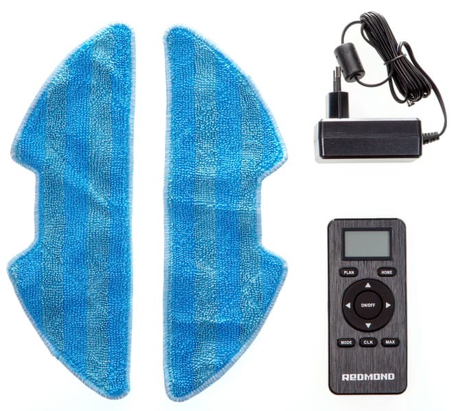 Запасные части и расходные материалы в комплекте поставки, таким образом, оказались представлены сменным фильтром, вторым комплектом боковых щеточек (первый комплект пользователь устанавливает сразу) и сменной тряпкой (насадкой) для влажной уборки.