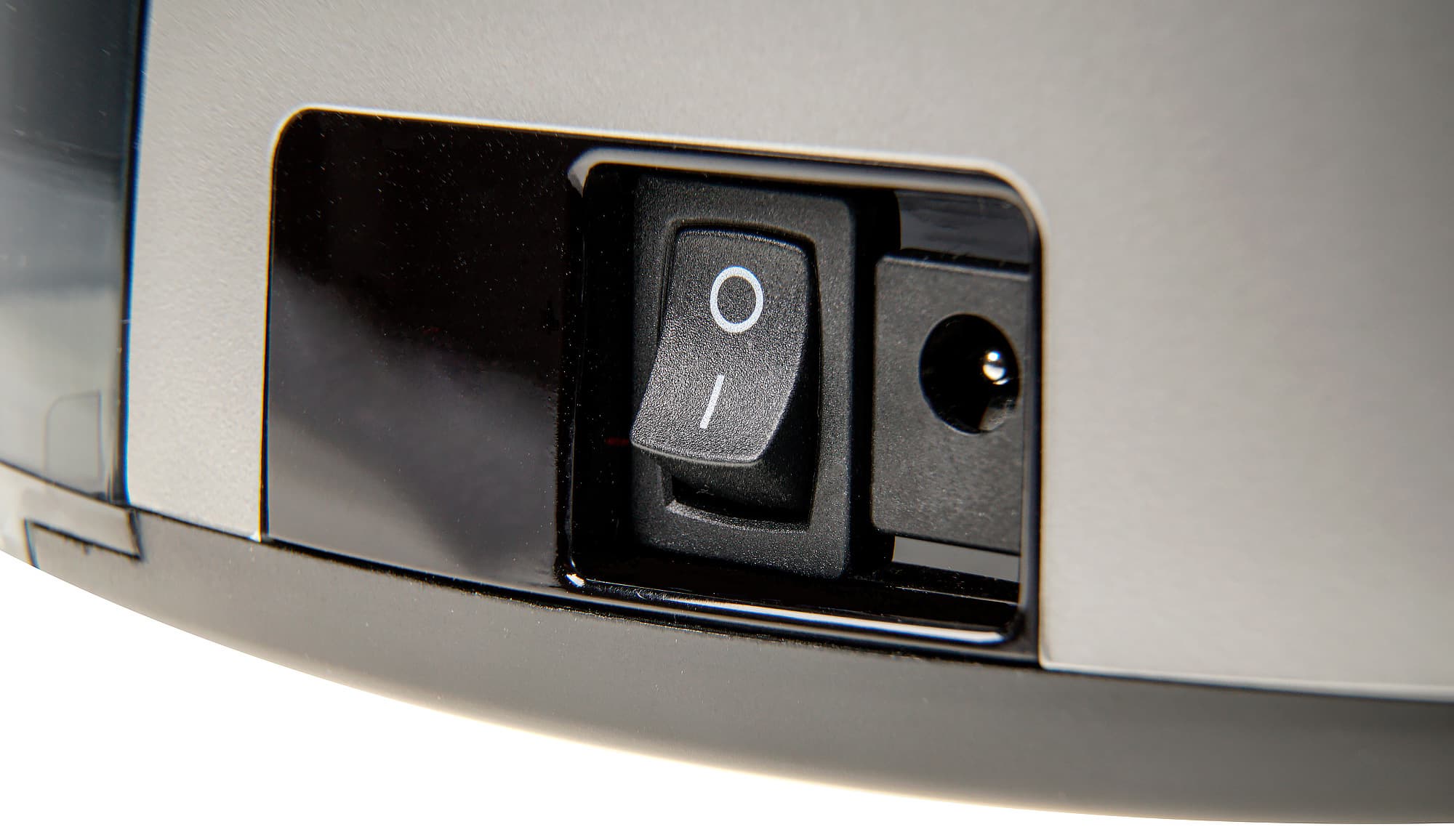 Выключатель устройства расположен на боковой стороне корпуса. Рядом с выключателем — разъем для зарядки пылесоса напрямую, минуя базу.