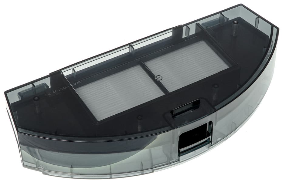 Модуль для влажной уборки состоит из двух частей — крупного контейнера для воды, в который вставляется мелкий отсек с HEPA-фильтром. Отсек для мусора открывается и закрывается с помощью пластиковой защелки. Для фиксации отсека для пыли внутри контейнера для воды используется еще одна защелка и специальная откидная ручка. Отверстие для наполнения находится на верхней панели вставки и закрыто резиновой пробкой.