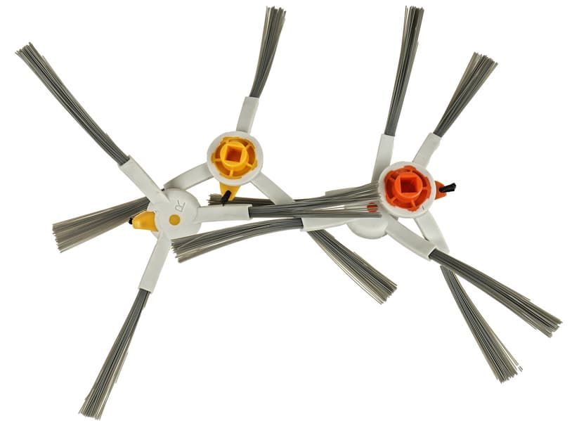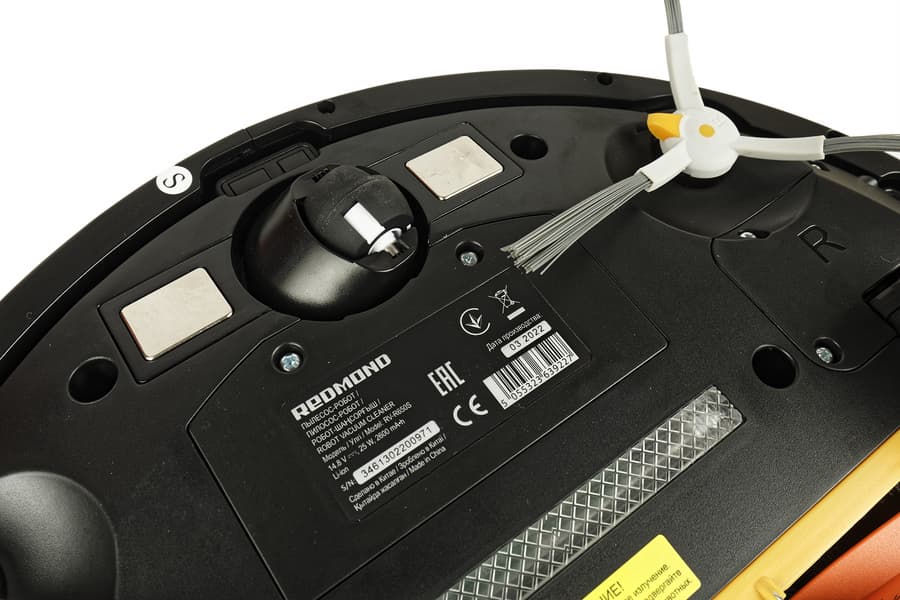 Съемные боковые щетки делятся на «левые» и «правые». Маркировка присутствует как на самих щетках, так и на корпусе пылесоса, поэтому перепутать их при установке можно разве что намеренно. К тому же левые и правые щетки можно отличить по цвету пластикового крепления. В комплекте с устройством идут две пары щеток.