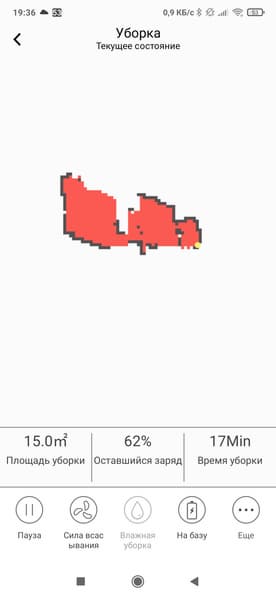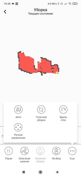 В нижней части экрана расположены кнопки управления, позволяющие поставить прибор на паузу, переключить режим уборки, изменить силу всасывания или отправить пылесос на подзарядку.