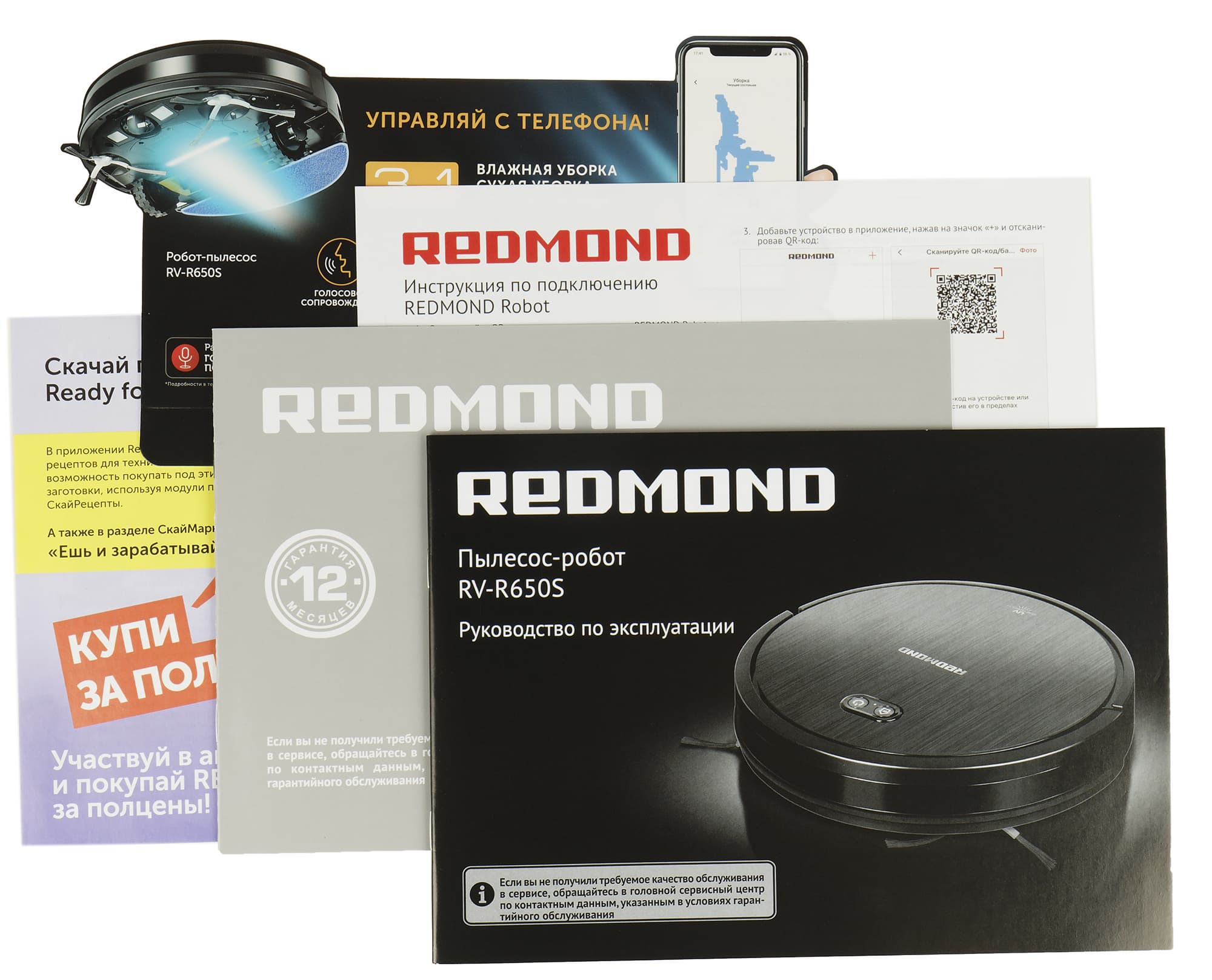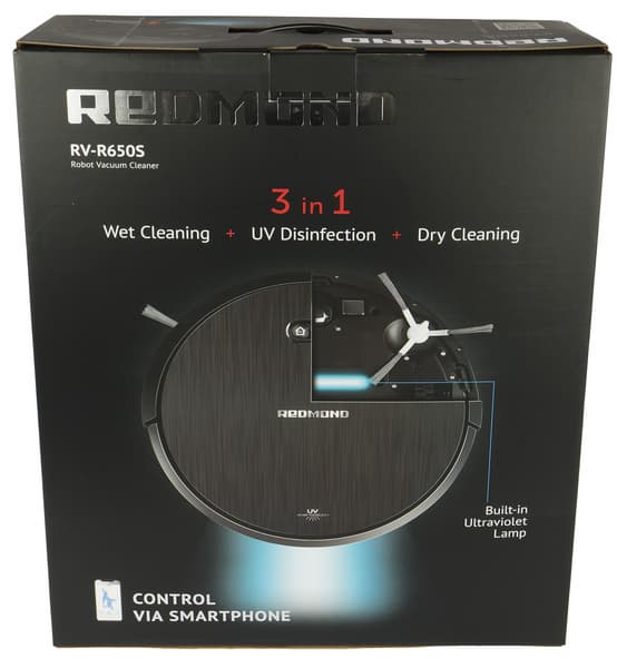 Прибор попал к нам на тестирование упакованным в картонную коробку с хорошо узнаваемым логотипом Redmond. Размер коробки оказался стандартным для роботов-пылесосов. Оформление строгое: черный фон и минимум информационного «шума».