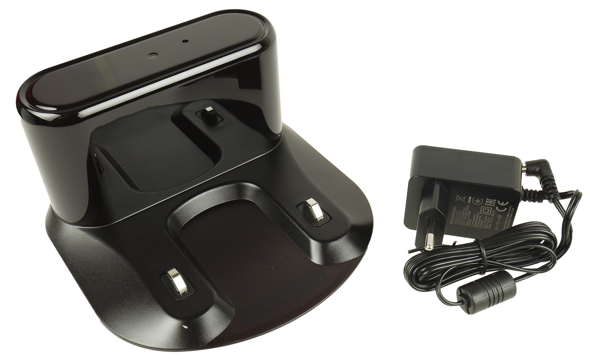 Верхняя часть пластиковой базы выполнена из ИК-прозрачного пластика, под которым стоят датчики, обеспечивающие позиционирование робота при возвращении на зарядку. У базы есть светодиод, сигнализирующий о ходе заряда батареи. Контакты подпружинены и имеют ход около 3 мм.