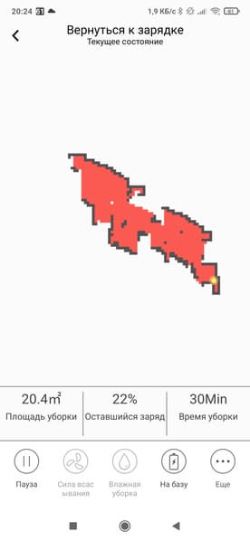 Дополнительное время позволило прибору добраться в труднодоступные участки (ловушку), которые были проигнорированы за первые 30 минут уборки, что в итоге приблизило итоговый результат уборки к 100%.