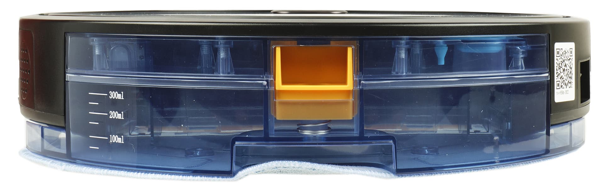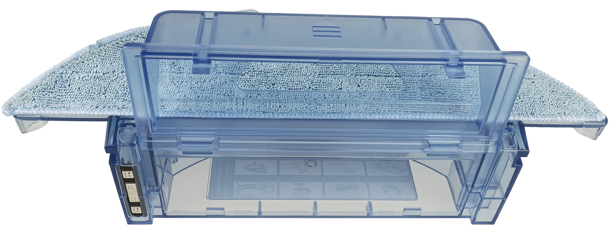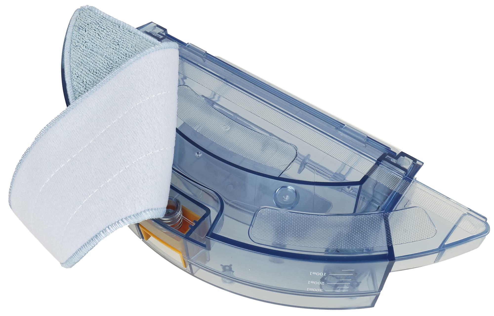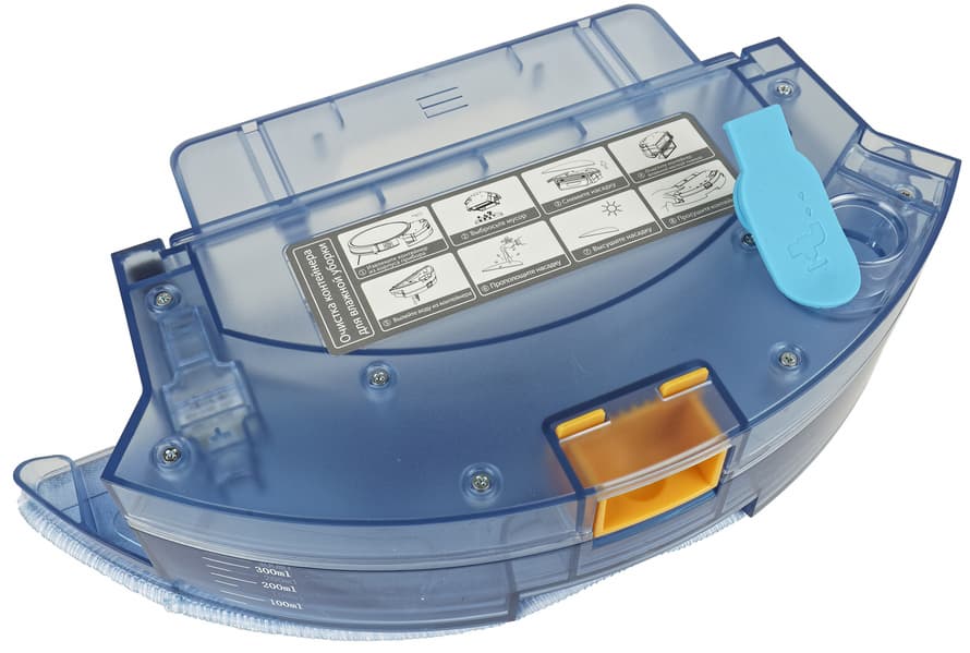 Вода, увлажняющая тряпку, поступает из бака через пять отверстий, а интенсивность подачи воды регулируется небольшим насосом, встроенным в контейнер. Сбоку у контейнера имеется градуировка, с помощью которой можно оценить объем оставшейся воды — от 50 до 300 мл.