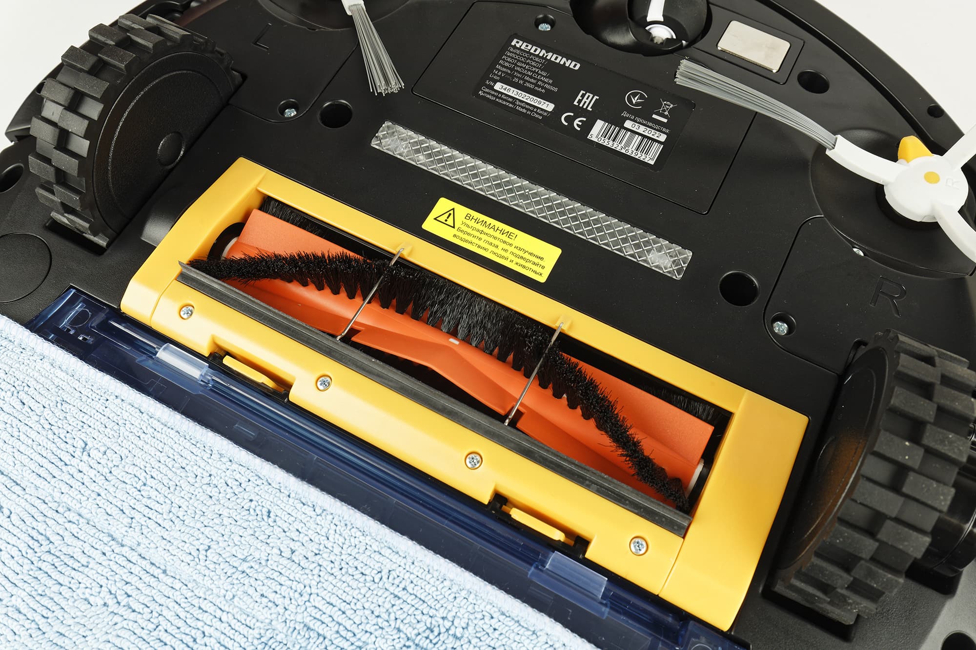 В центре нижней панели расположена основная электрощетка с V-образными резиновыми ламелями, чередующимися с рядами синтетической щетины. Фиксируется она обычной пластиковой рамкой с двумя защелками.