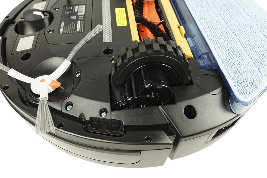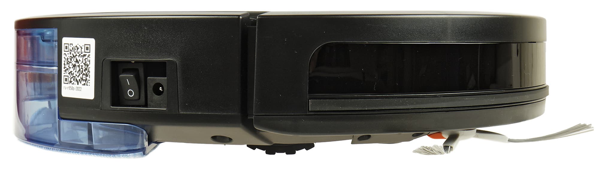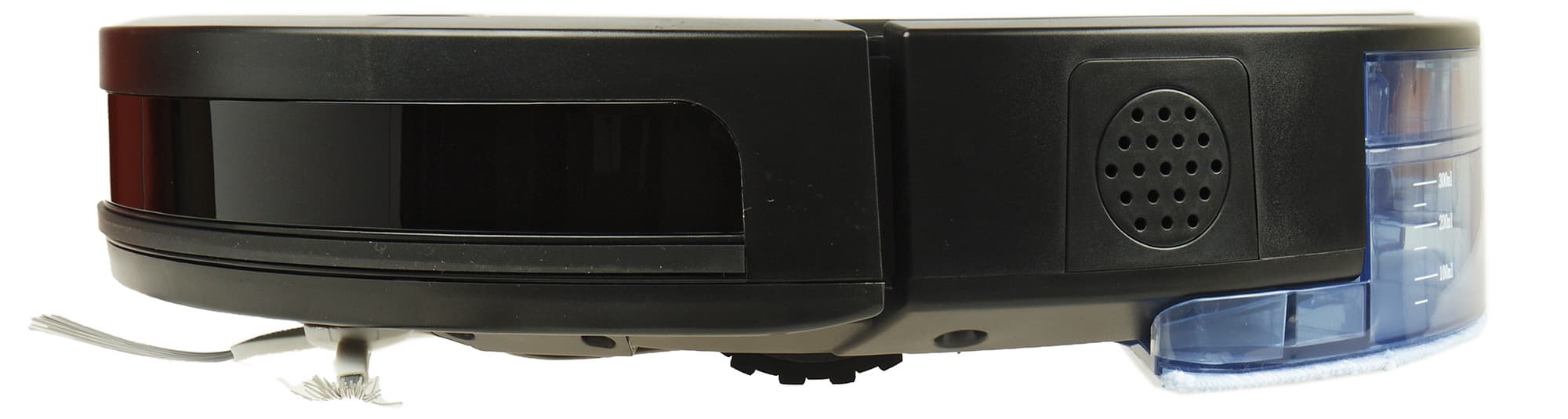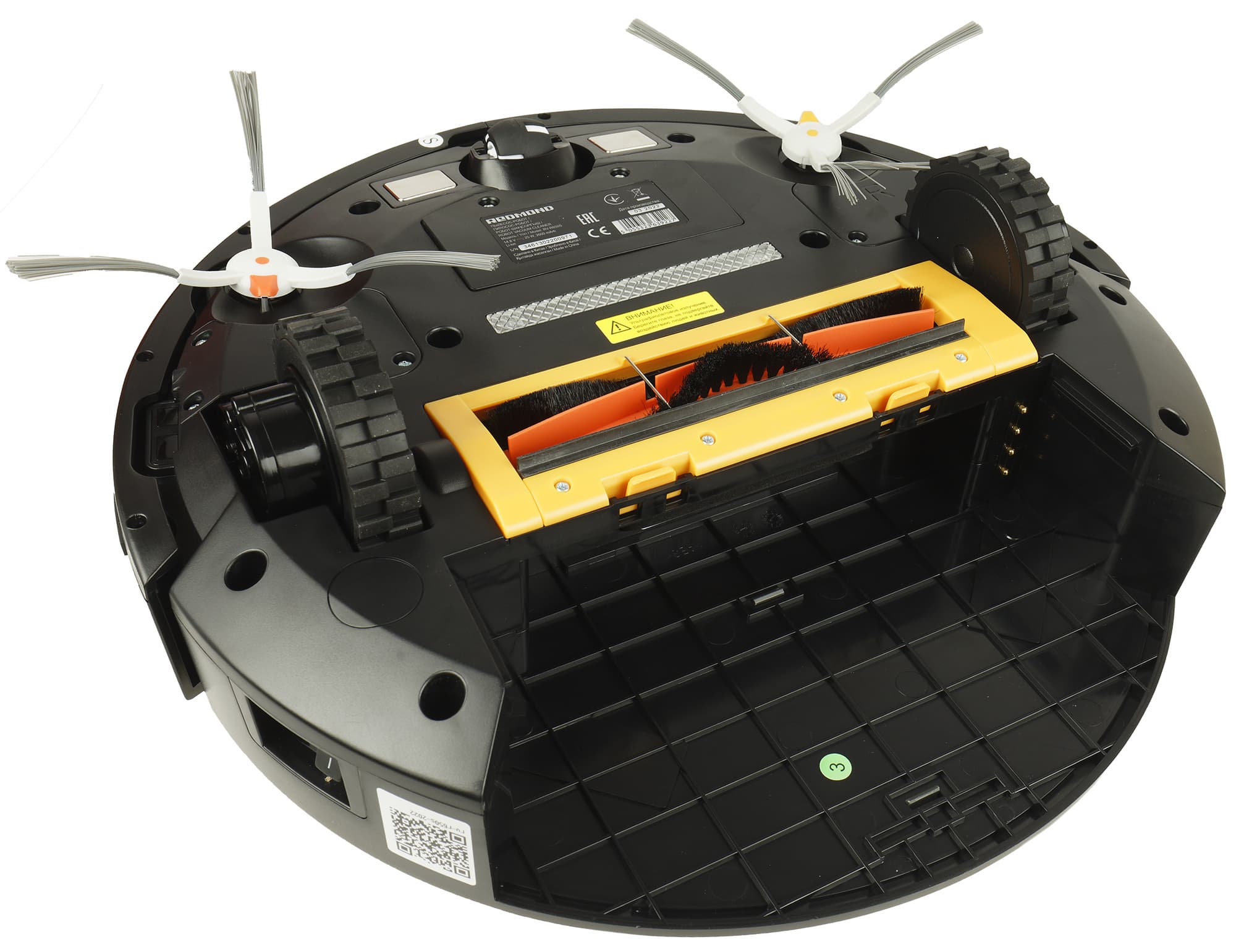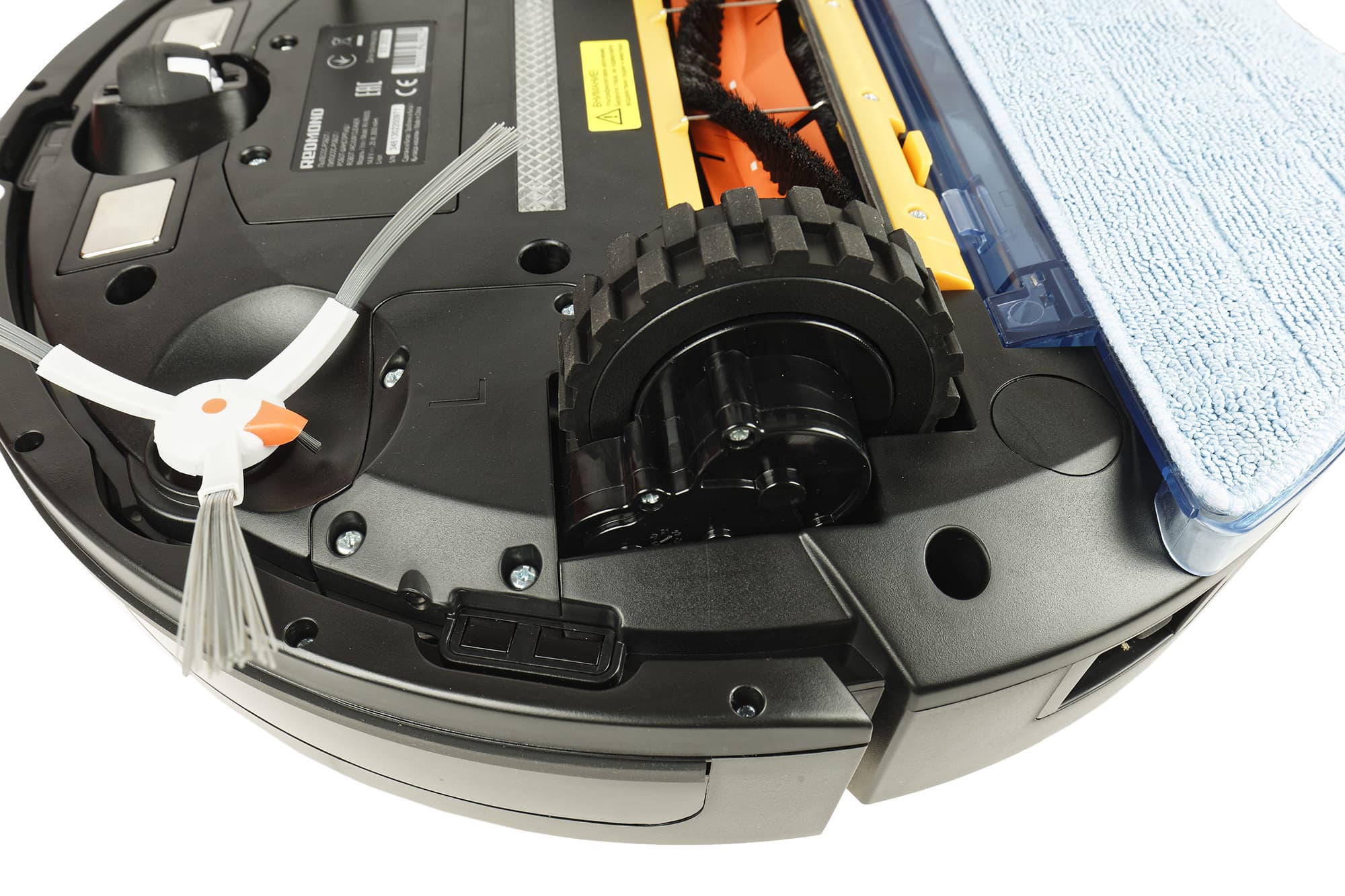 Направляющее колесо пластиковое. Оно заключено в пластиковую же сферу, допускающую свободное вращение на 360°. По обе стороны от колеса размещаются контакты для зарядки на базе. Также в передней части корпуса можно увидеть гнезда для крепления боковых щеток, а по центру и по бокам — окошки оптических (инфракрасных) датчиков поверхности.