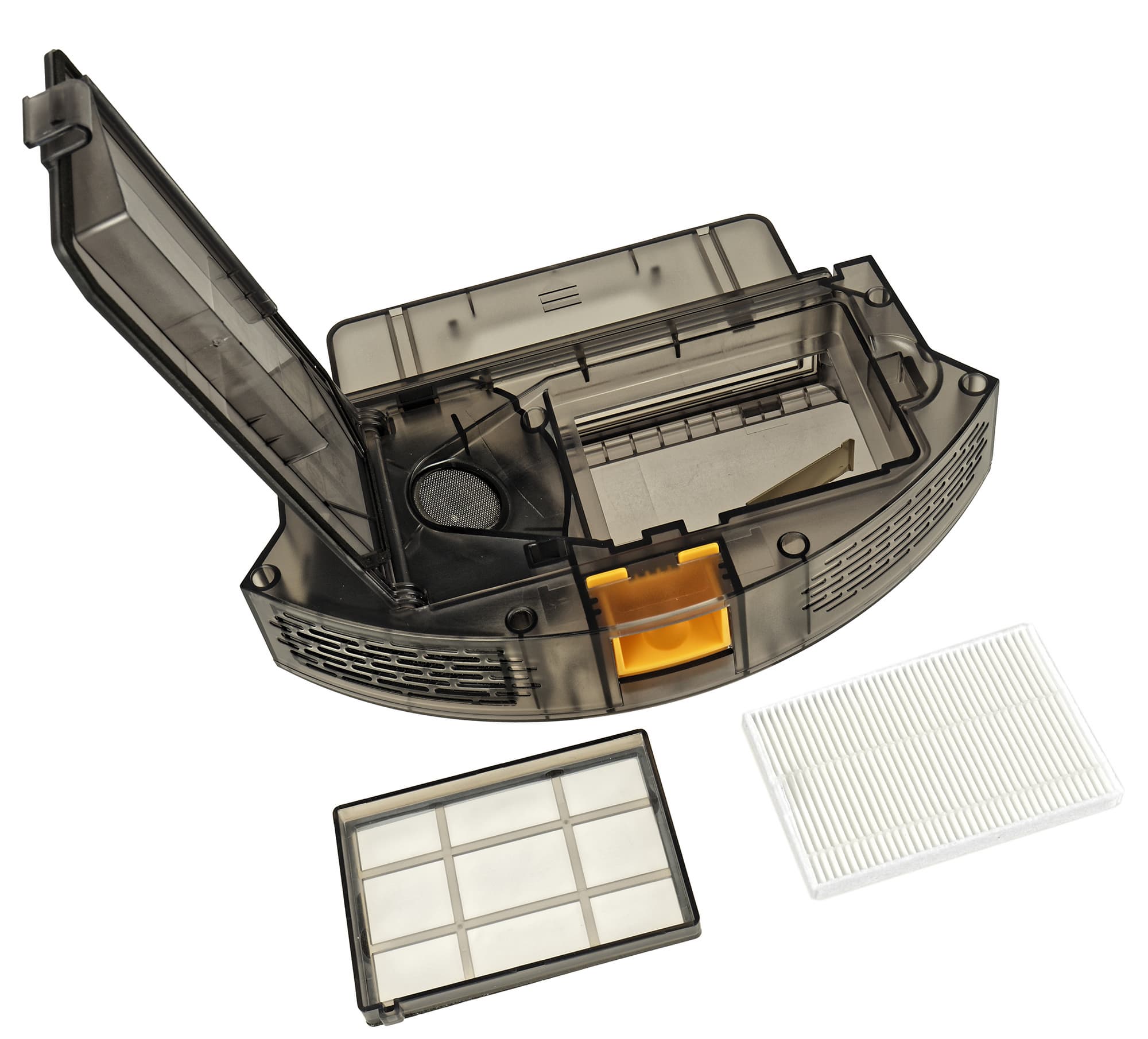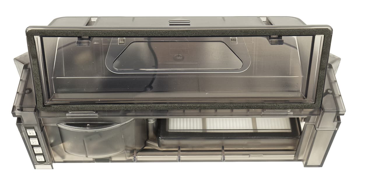 В контейнере для мусора, таким образом, с одной стороны имеется пластиковая «шторка», которая не даст мусору высыпаться при переноске модуля, а с другой — расположена еще одна откидная крышка, под которой прячется съемный фильтр грубой очистки из синтетического материала и HEPA-фильтр.