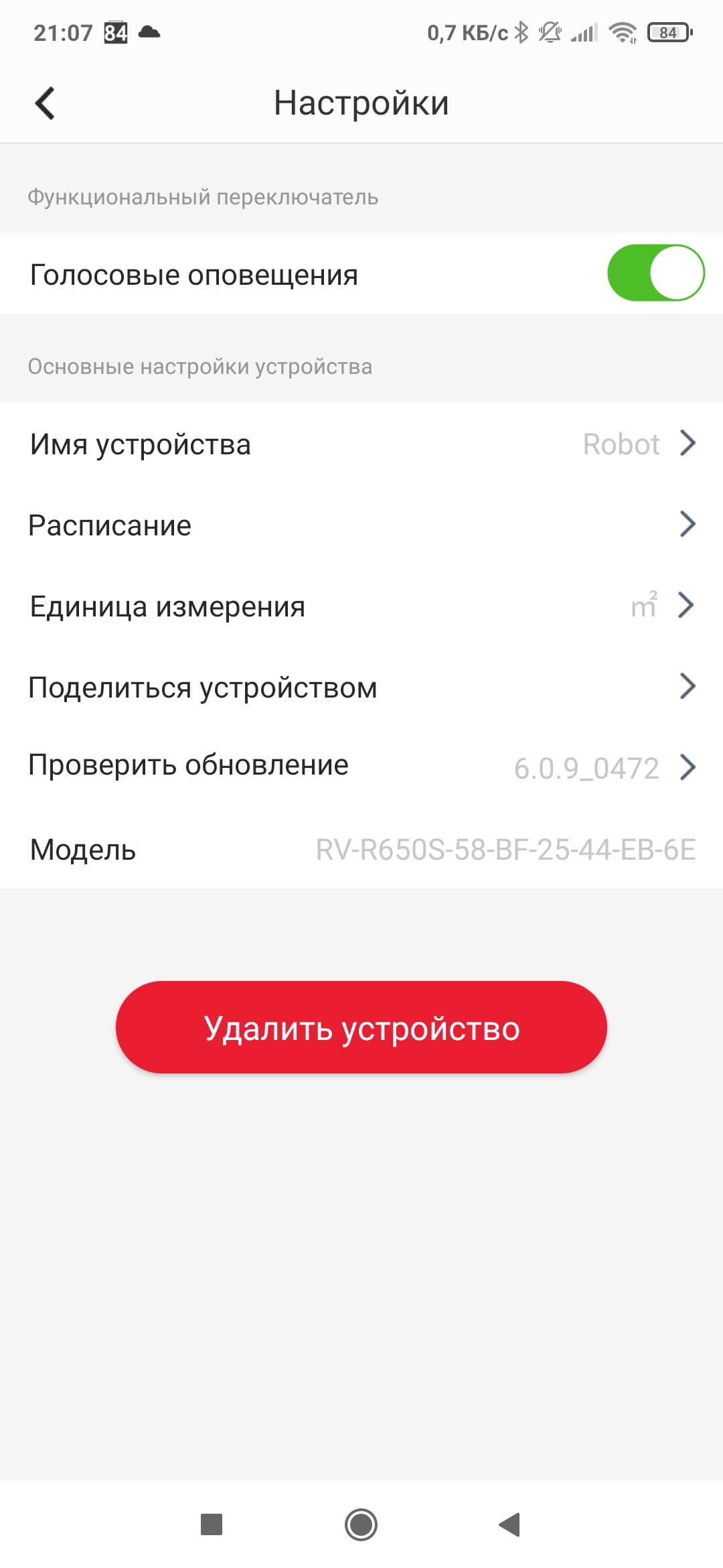 С помощью приложения мы можем включить, либо отключить голосовые оповещения, настроить уборку по расписанию, установить единицы измерения убранной площади, а также поделиться доступом к пылесосу с другими пользователями.