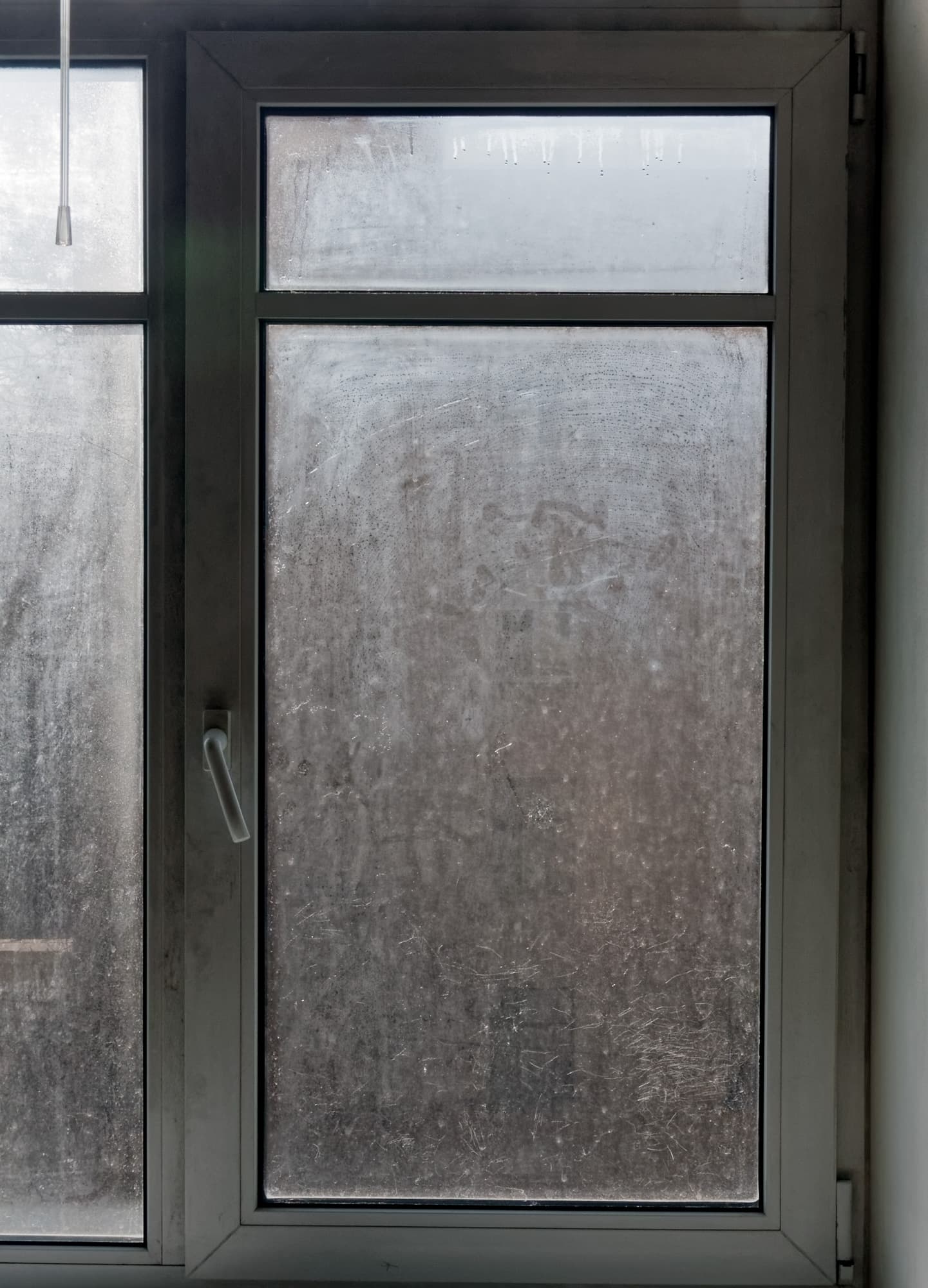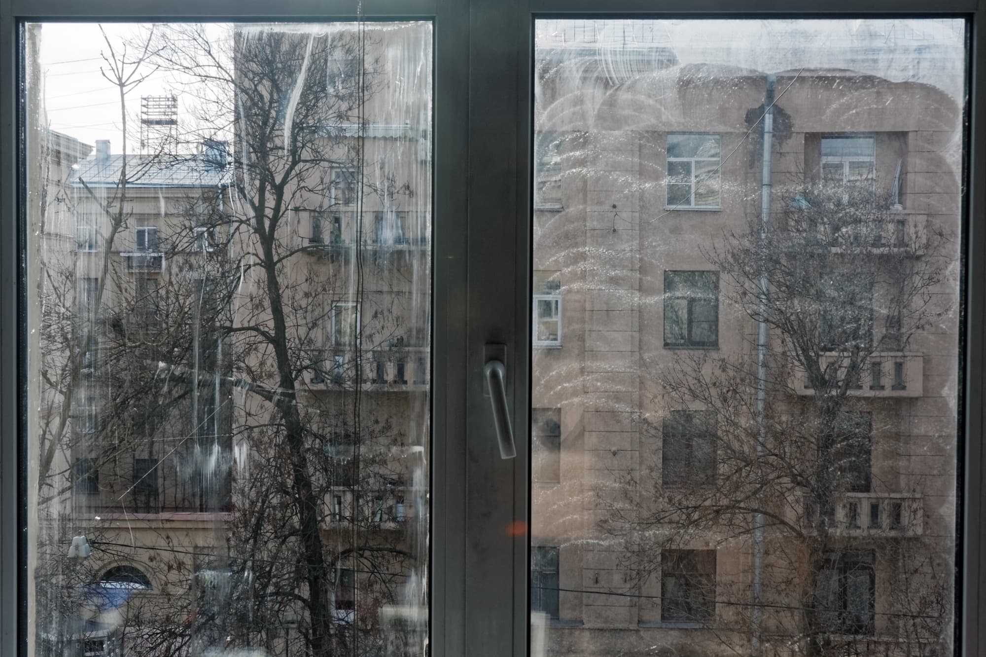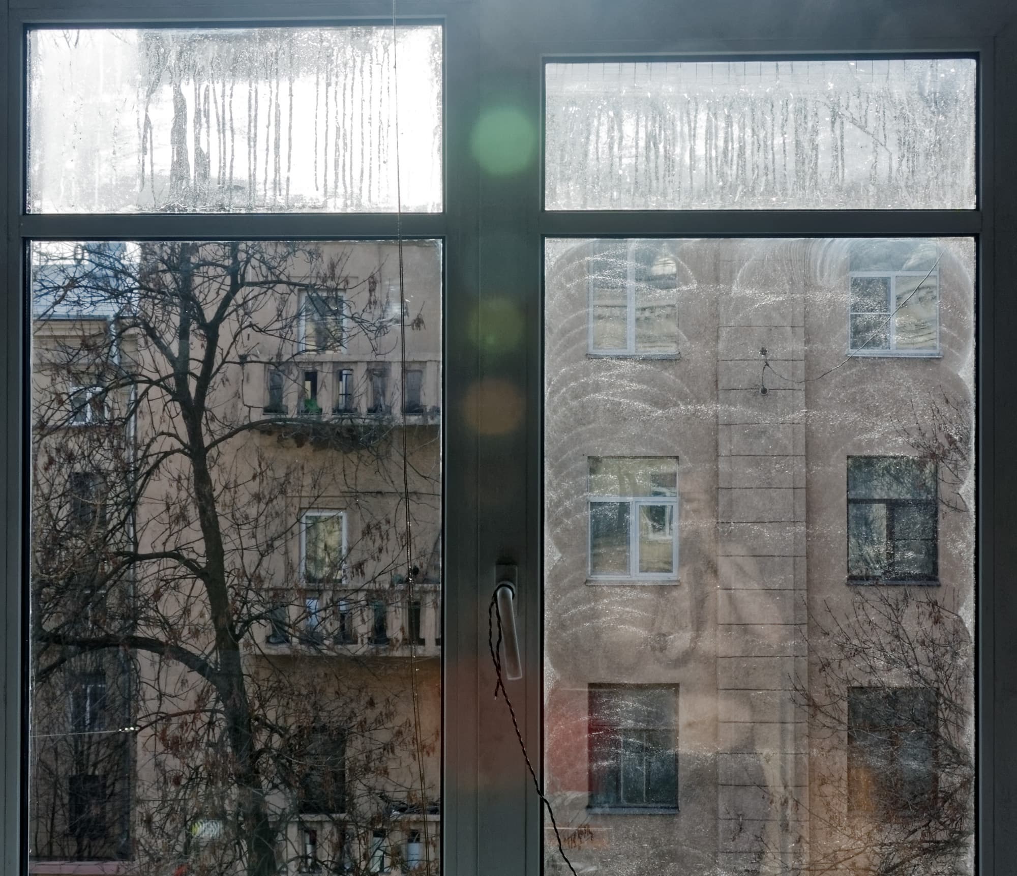Наше второе тестовое окно располагалось в том же доме, но выходило во двор. Оно также простояло грязным около 6 месяцев, однако степень его загрязнения оказалось значительно ниже. Погода на этот раз оказалась пасмурной, поэтому загрязнение на фотографиях видно хуже. Вот так окно выглядело изначально.