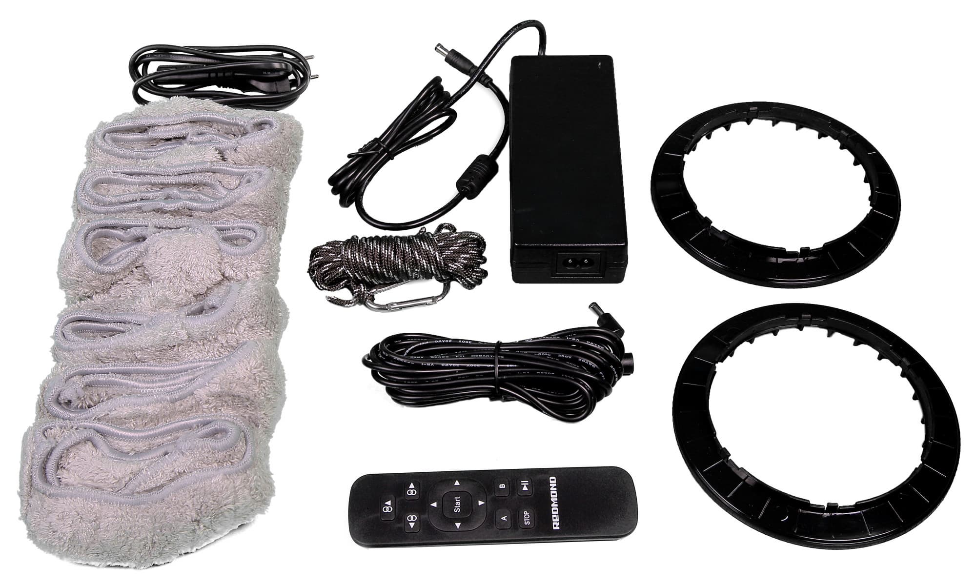 На верхней панели расположены индикаторы состояния, решетка звукового сигнализатора, разъем низковольтного питания и сенсорные кнопки управления (кнопка включения и кнопка Start). Рядом с кнопкой Start располагается логотип Redmond. Под выступающей частью (она же — ручка для переноски) можно увидеть отверстия, через которые в процессе работы прибора будет выдуваться воздух.