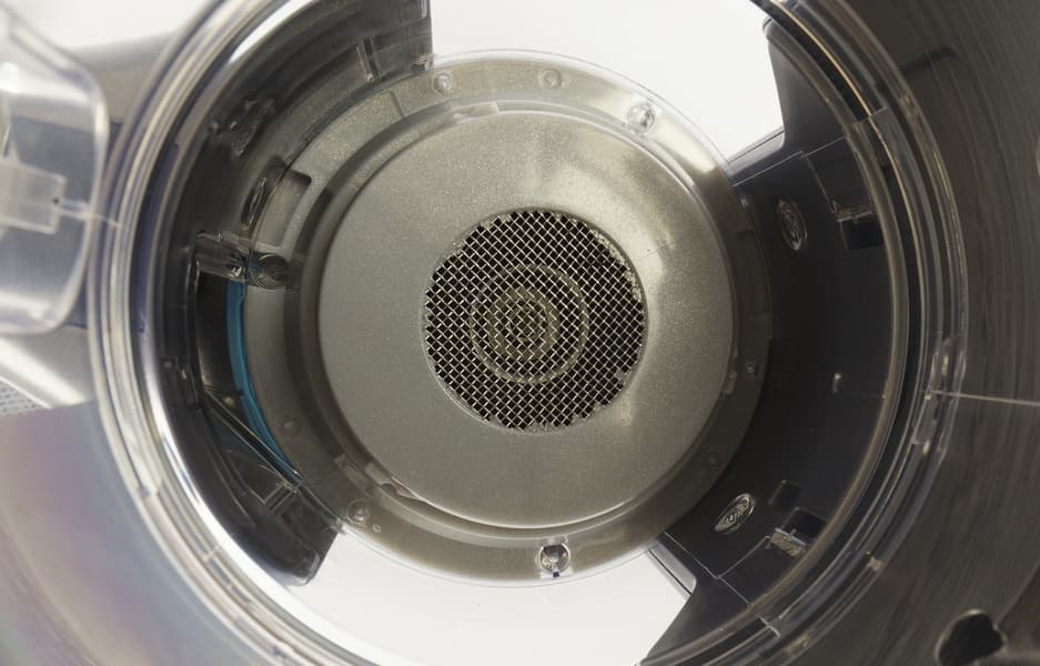 Отверстия для выхода воздуха располагаются по бокам моторного отсека. Под съемной верхней крышкой скрывается фильтр тонкой очистки — цилиндрический HEPA-элемент класса H13.