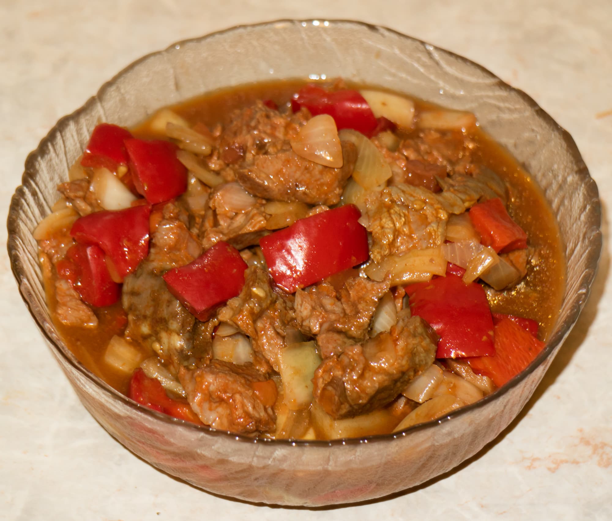 Говядина (филе) — 450 г, перец болгарский — 200 г, лук репчатый — 100 г, паста томатная — 70 г, вино красное (сухое) — 30 мл, вода — 1,5 л, соль, специи.