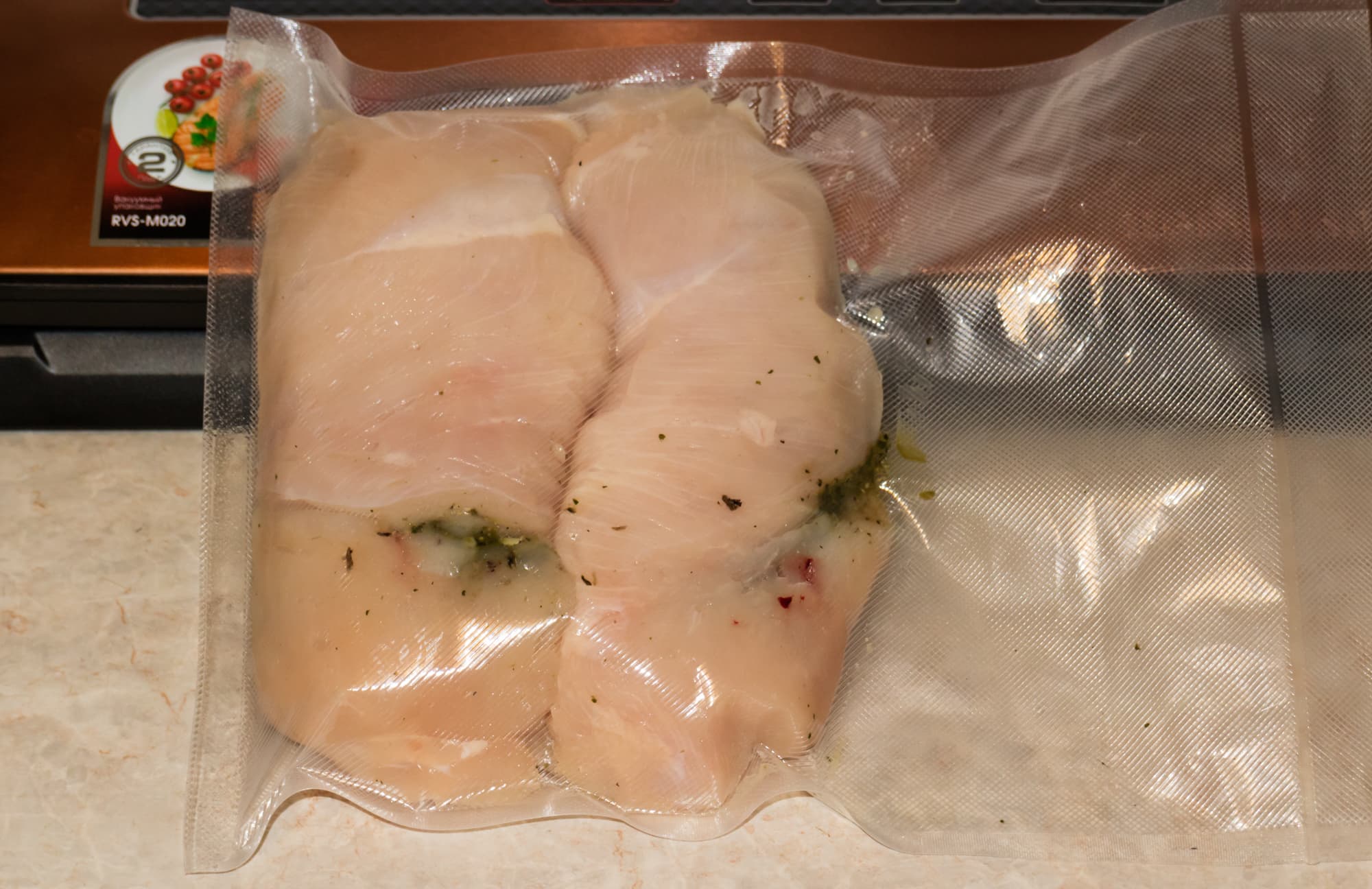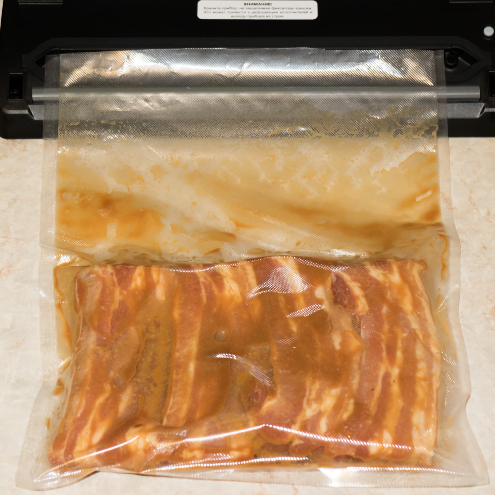 Перец чили и чеснок измельчили, добавили соевый соус, томатную пасту, горчицу, мед и соль. Натерли маринадом ребра и выложили в пакет. Ребер оказалось много (около 1,8 кг), так что мы решили разделить их на две части. Выбрали режим влажного продукта и мощную откачку воздуха. При вакуумировании начала интенсивно выделяться влага. Жидкость закрыла доступ выходу воздуха из пакета, поэтому в нижней части пакета скопились пузыри оставшегося воздуха. Зато на качество запечатывания пакета наличие влаги на шве никак не повлияло. Шов цельный и ровный.