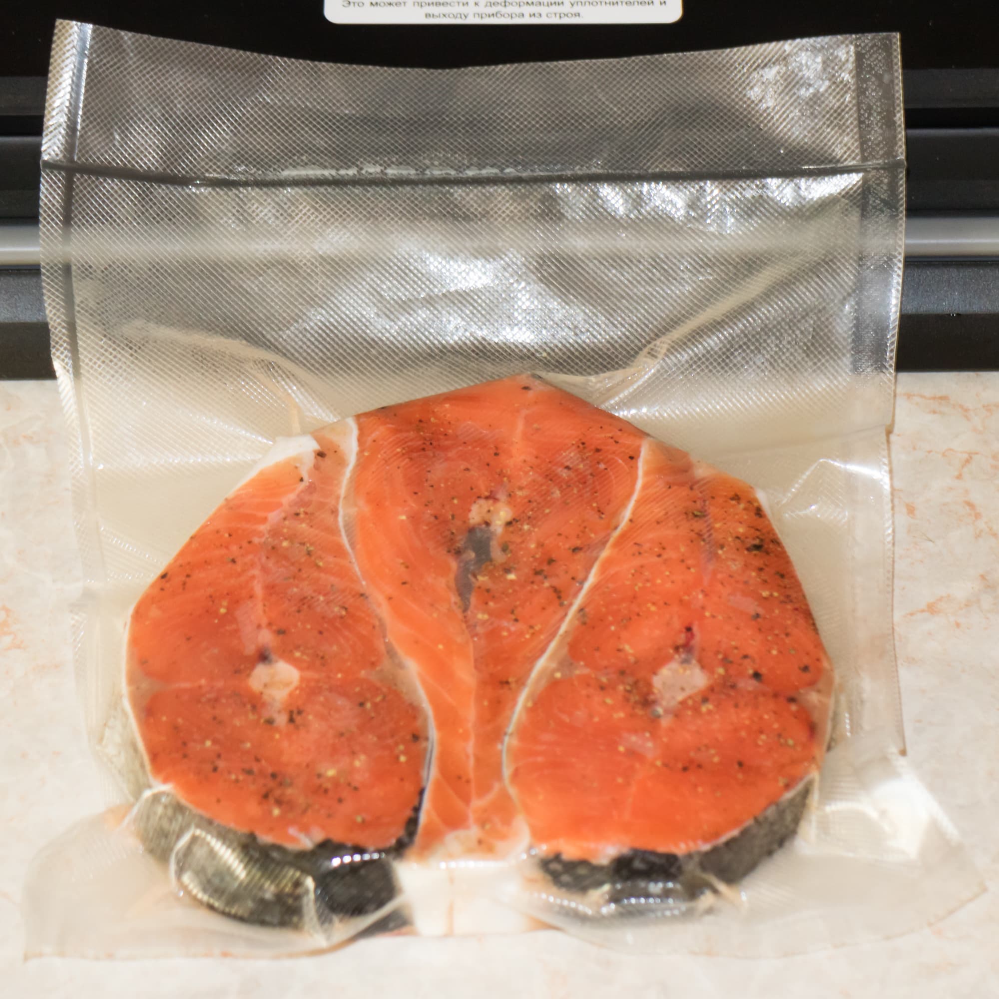 Одним из дополнительных тестов стало вакуумирование предварительно засоленного лосося. Параметры: влажный продукт, турбо-вакуумирование.