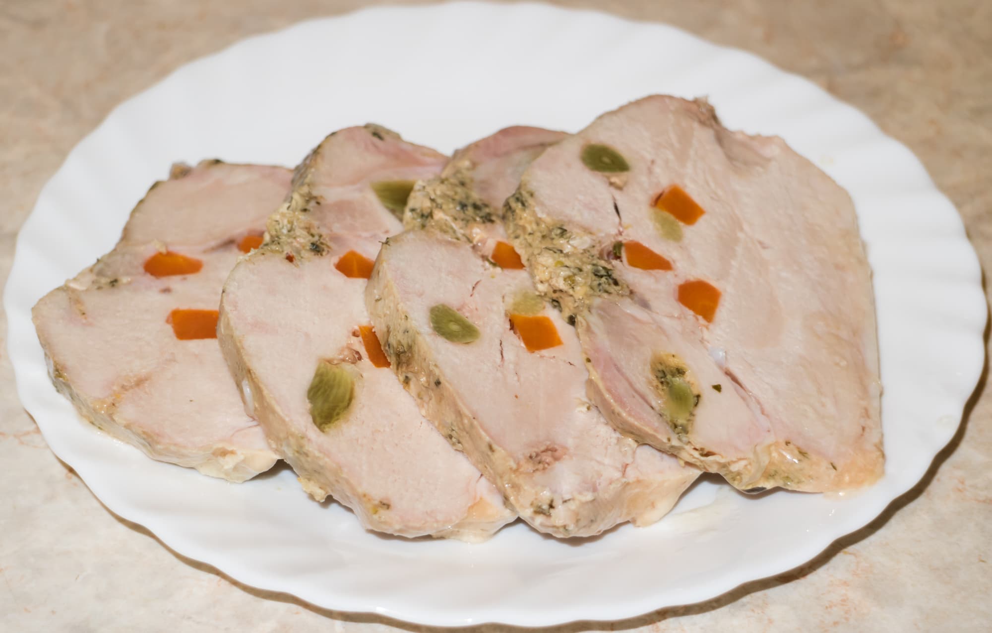 Варили на 65 °C в течение 4 часов. Затем полностью остудили. Рулетики сохранили форму, начинка осталась внутри.