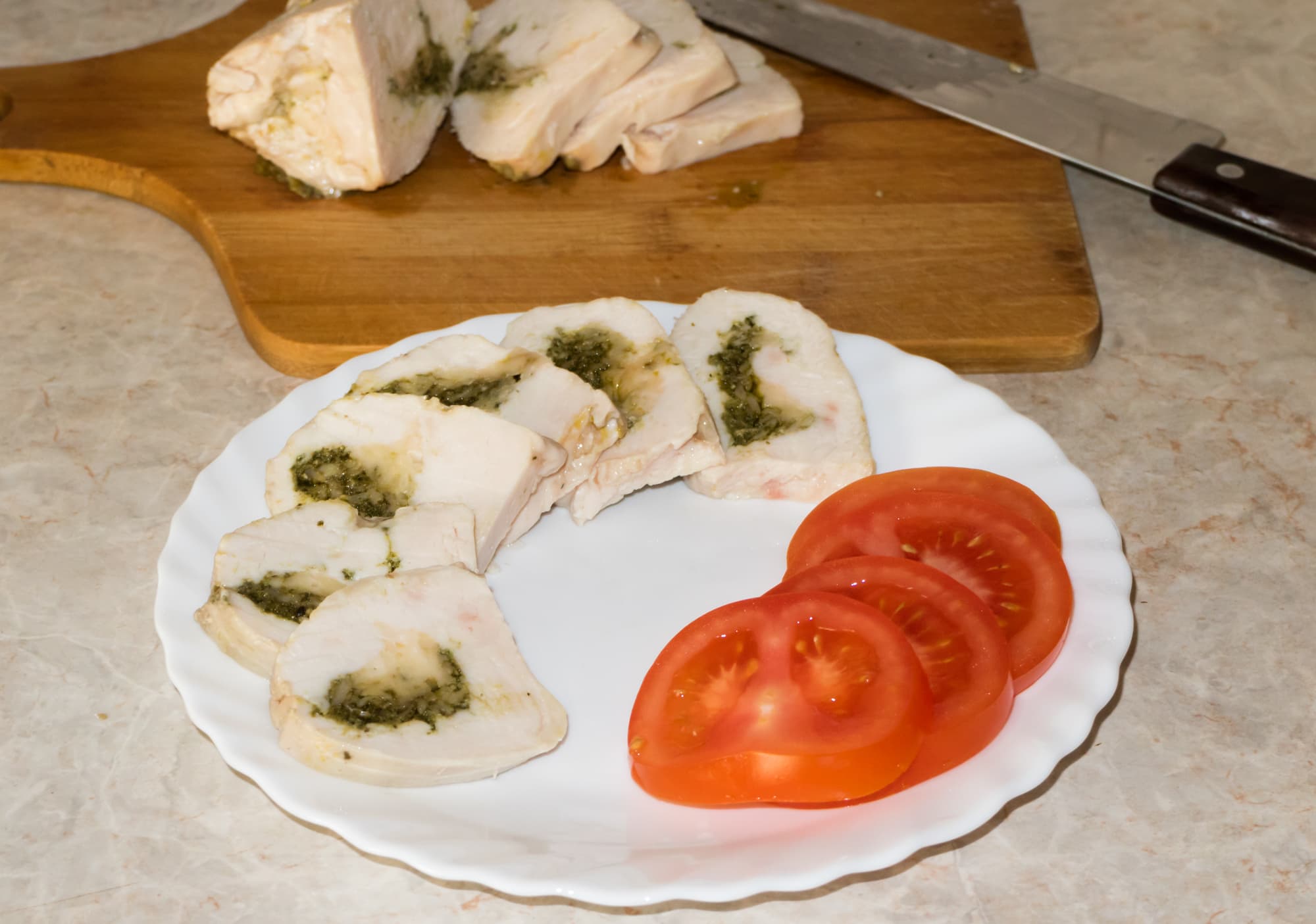 Оригинальный рецепт приведен для тех, кто решит повторить именно его. Мы же воспользовались рецептом лишь как ориентиром. Фаршировать куриное филе было решено смесью зеленого песто и натертого твердого сыра. Куриное филе разрезали вдоль так, чтобы получить один большой пласт. Затем отбили его, чтобы пласт стал более-менее равномерен по толщине. С одного края выложили начинку и скрутили рулет.