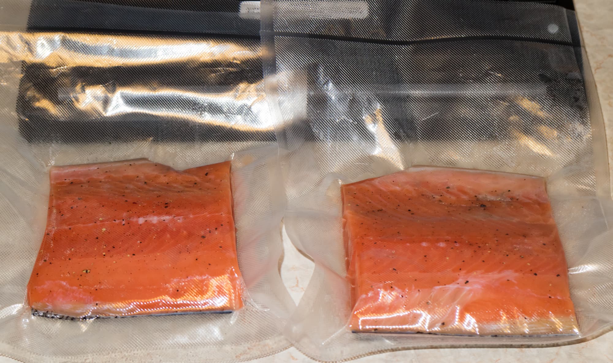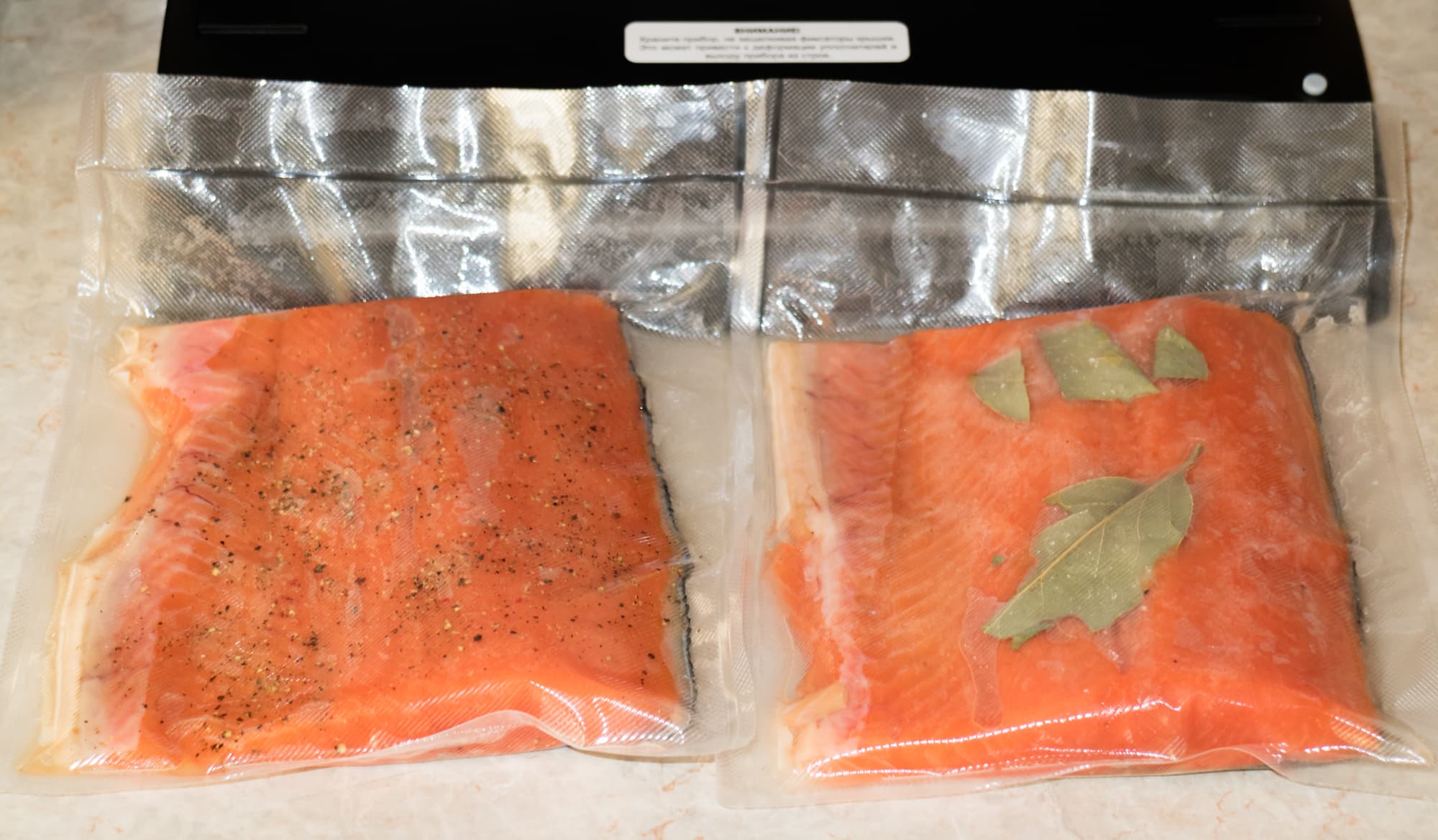 Разморозили рыбу, филировали, нарезали на куски, свободно помещающиеся в небольшой пакет. Натерли каждый кусок смесью соли и сахара. Один кусочек присыпали свежемолотым черным перцем, ко второму добавили пару лавровых листиков. Поместили рыбу в пакеты. Три изначально отрезанные стейка присолили, поперчили и тоже положили в вакуумный пакет — их мы приготовим в су-виде на 62 °C.