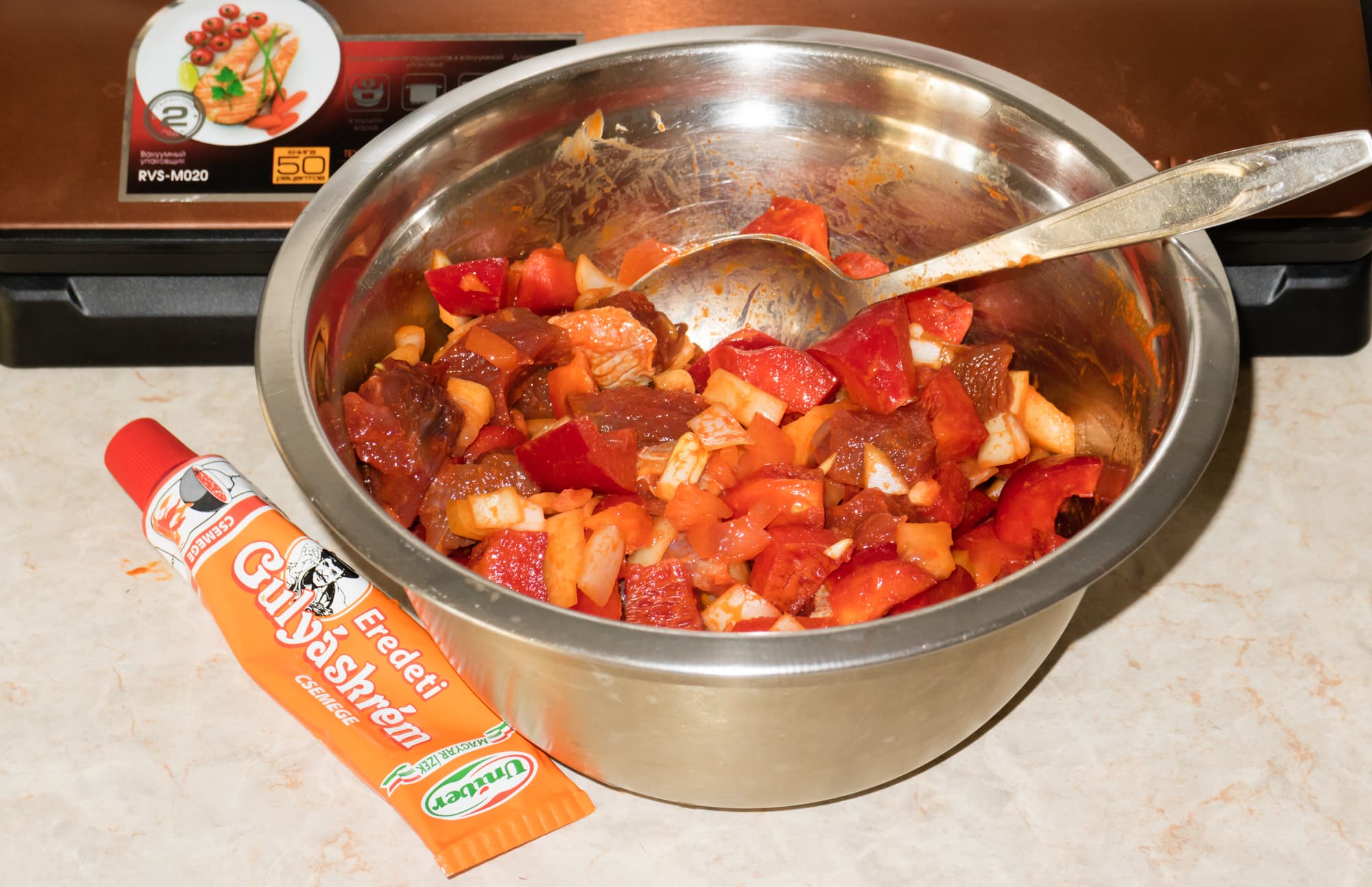 Говядину, перец и лук нарезали кубиками. Вместо томатной пасты добавили венгерскую пасту для гуляша. Перемешали в чашке все ингредиенты (кроме воды).