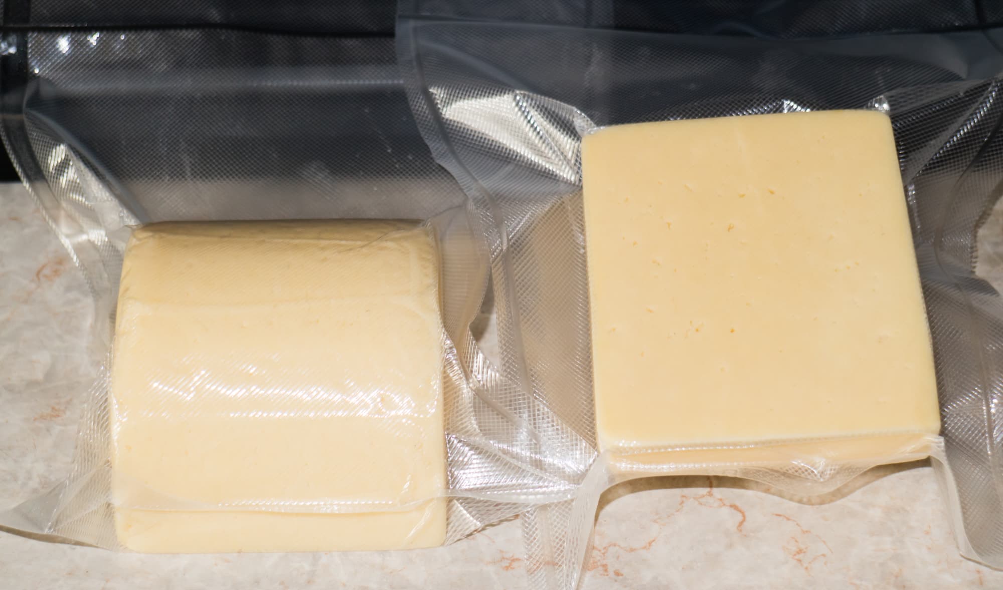 Килограммовую головку Чеддера разрезали пополам. Затем взяли большой пакет, входящий в комплект к прибору, и сделали из него два поменьше. Для этого разрезали пакет на две равные части, запаяли края и отрезали швы с узкой стороны.