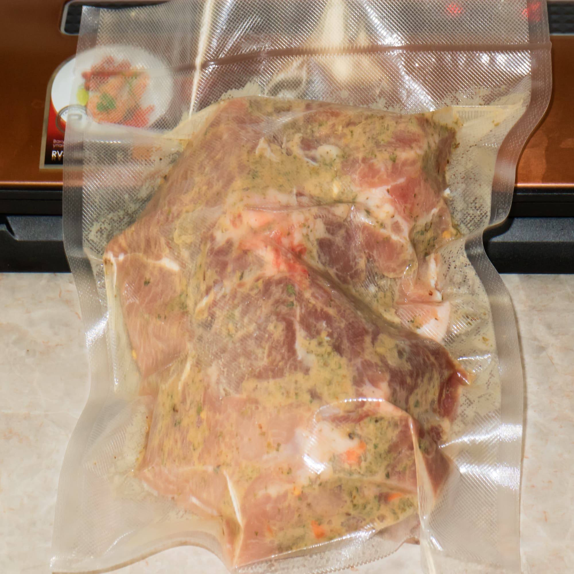 Морковь нарезали соломкой. Нашпиговали свинину кусочками моркови и чесноком, натерли солью, специями и горчицей. Выложили мясо в пакет и завакуумировали. После чего оставили маринованную свинину в холодильнике на ночь. При вакуумировании использовали режим нормальной откачки воздуха, тип продукта — влажный. Воздух откачан неплохо. Влаги выделилось немного, так что она никак не повлияла на качество запечатывания. Пакет закрыт качественно — шов ровный, без заломов и незапечатанных отрезков.