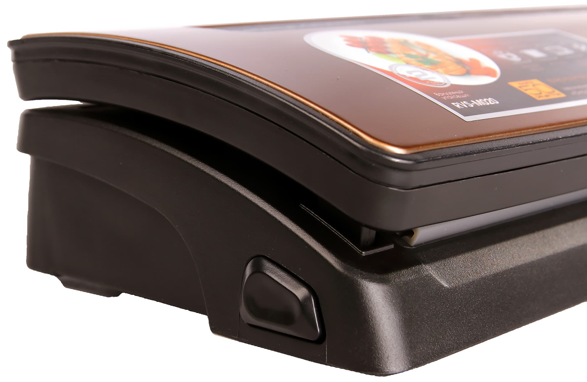 На боковых сторонах основания находятся кнопки разблокировки, которые предназначены для открывания крышки по завершению процесса вакуумирования и запечатывания пакета. Соответственно закрывается откидная крышка при нажатии на передние углы.