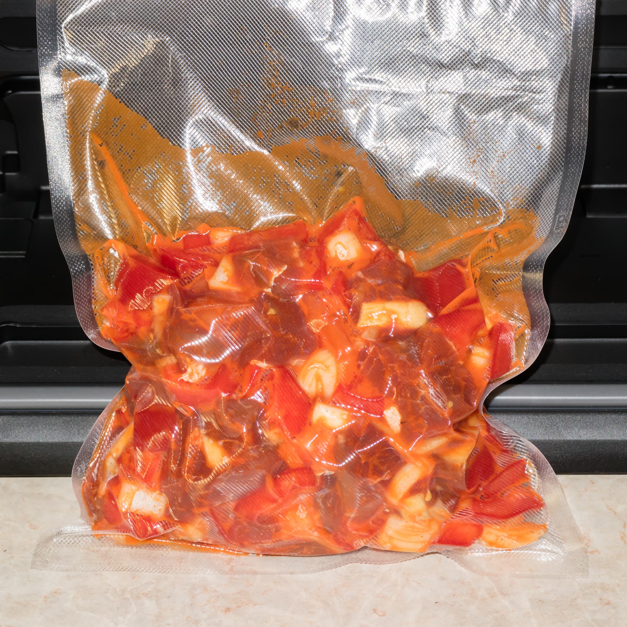 Выложили мясо с овощами в пакет и упаковали в режиме влажного продукта при нормальной мощности вакуумирования. Ничего неожиданного или неприятного не случилось. Воздух откачался, влага не достигла краев пакета. Шов запаян качественно.