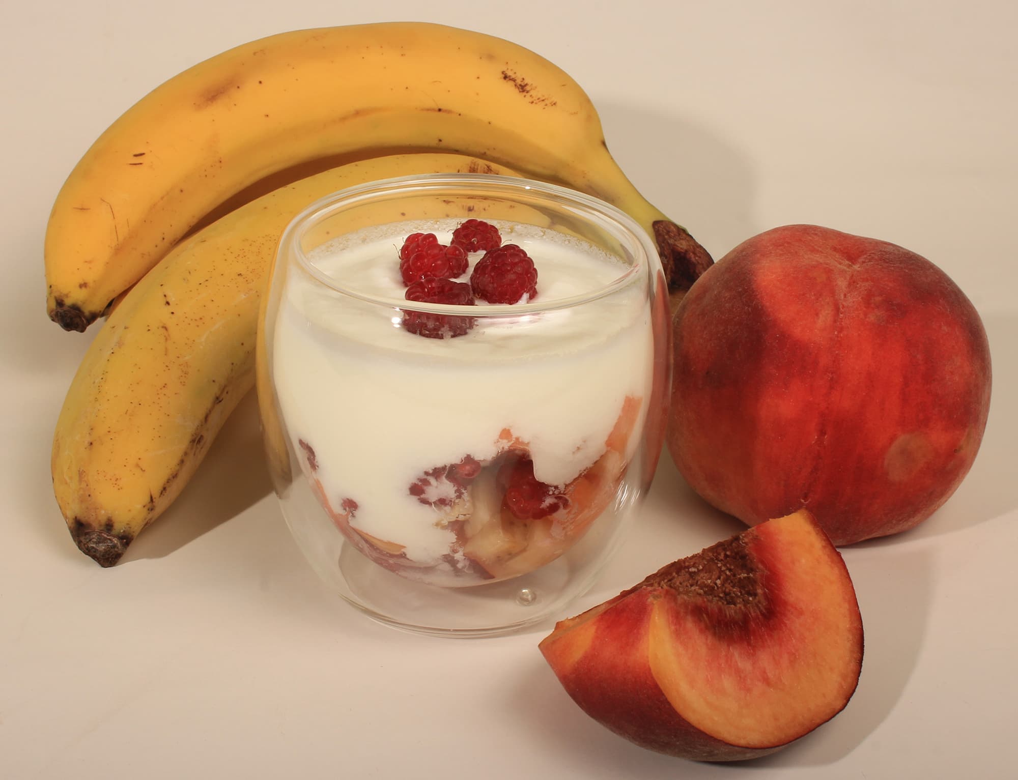 Салат из персика, бананов и малины с йогуртом