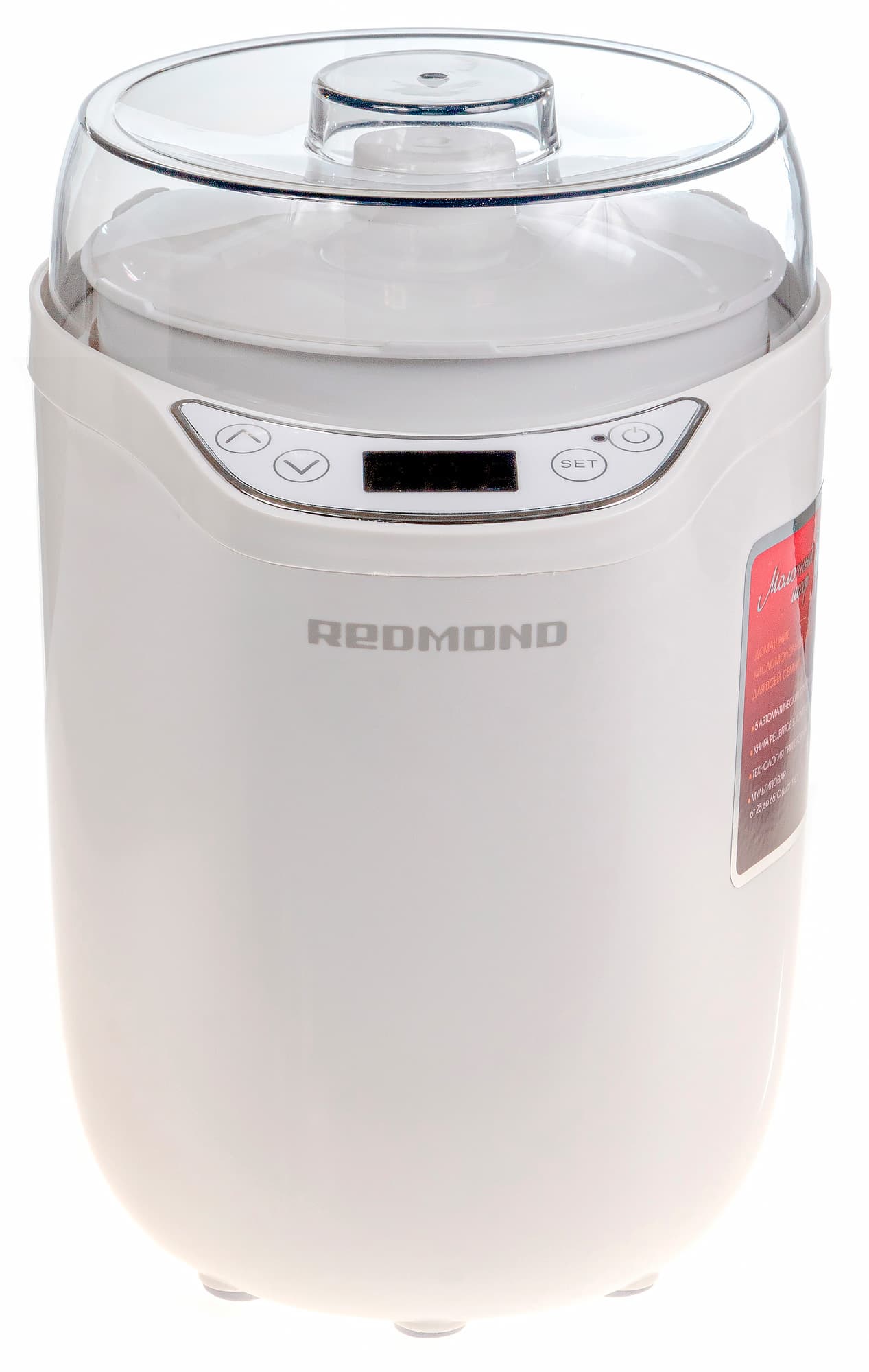 На одной из условно боковых сторон на шести языках, обычных для Redmond (русский и английский вошли) перечислены технические характеристики: напряжение в сети, мощность, материал корпуса (пластик), наличие пяти программ, таймер на 99 часов, электронный тип управления. Отмечается также, что в комплект входит сито для творога и два стакана объемом 1600 и 1800 мл.