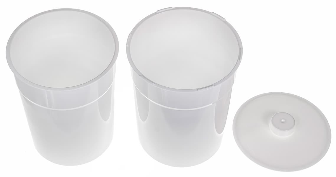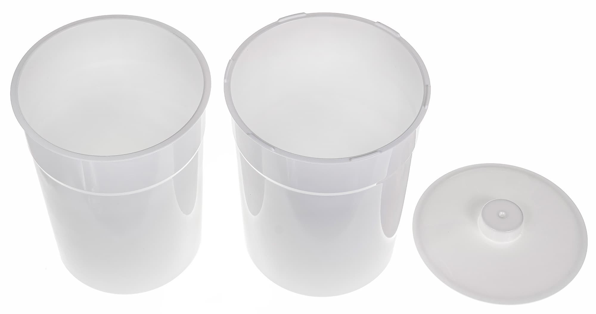 Оба стакана сделаны из белого пластика и при хранении вставляются один в другой и в корпус. Стакан в корпус просто ставится, он никак не закреплен. Во вставленном виде оба стакана немного выше и уже края корпуса, поэтому его можно извлекать из корпуса или ставить в него с продуктом внутри. Кроме того, края стакана немного утолщены, так что можно доставать и за него.