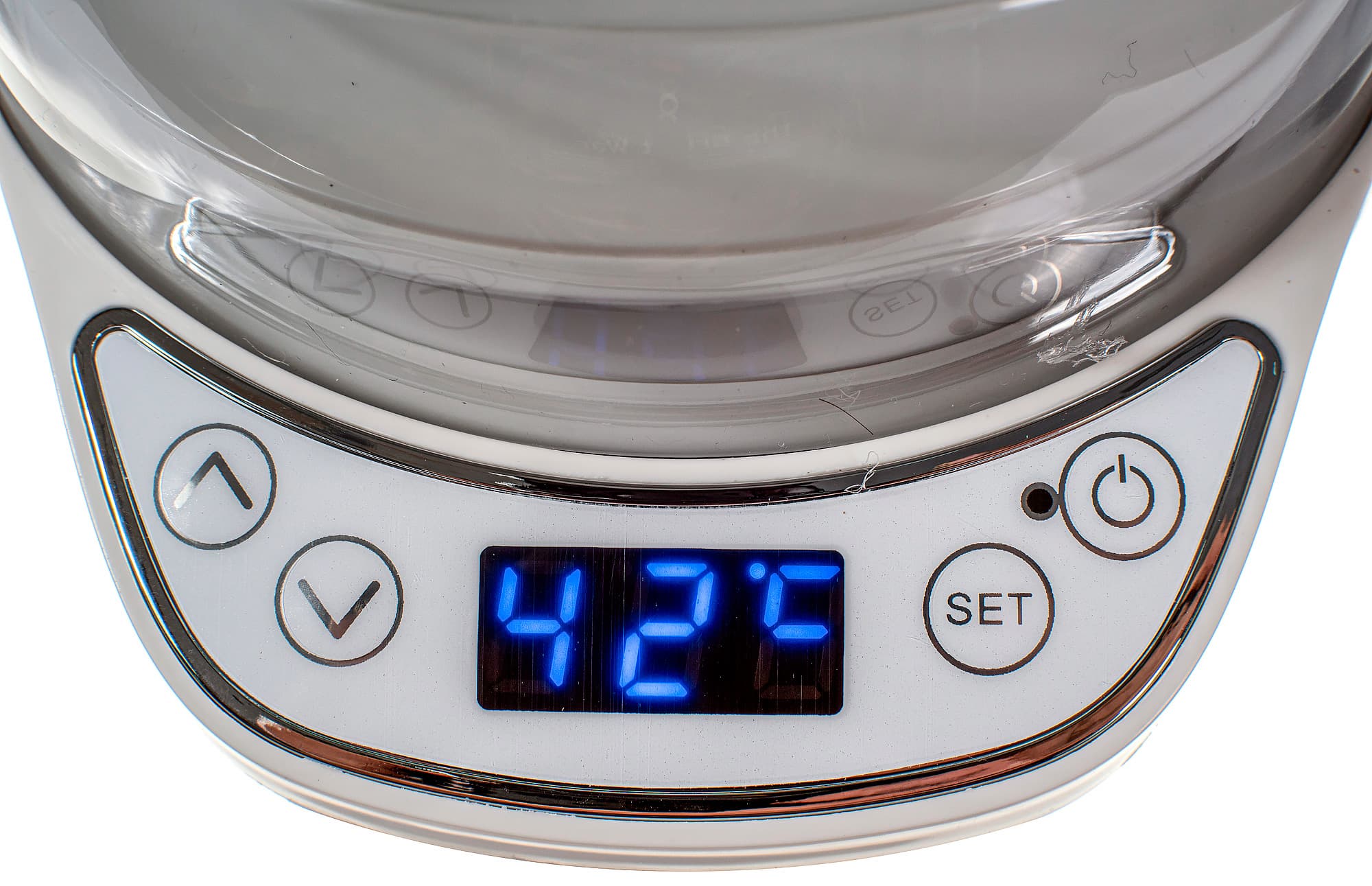 Панель управления — это светодиодный дисплей и четыре пластиковые кнопки: вверх, вниз, «Вкл.» и «Set». Между последними есть индикатор работы прибора.