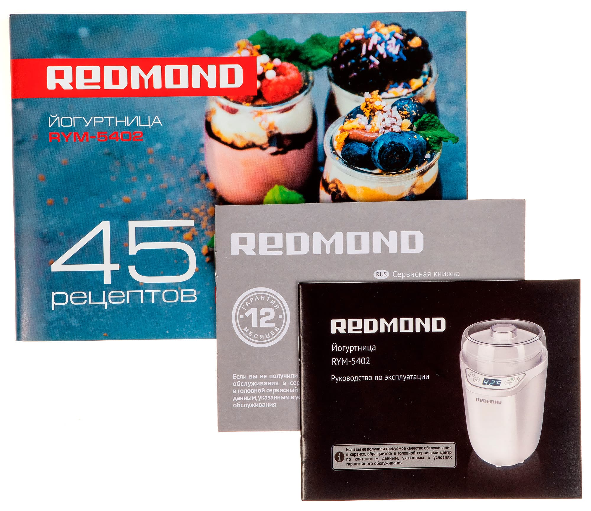 В комплекте есть также бумажная книга рецептов для йогуртницы на 45 рецептов, которую в электронном виде не получить, разве что поставить приложение «Готовим с Redmond». Первые 19 страниц книги — это, как обычно, реклама другой техники компании, зато потом мы получаем достаточно полное представление о том, что можно приготовить в йогуртнице: