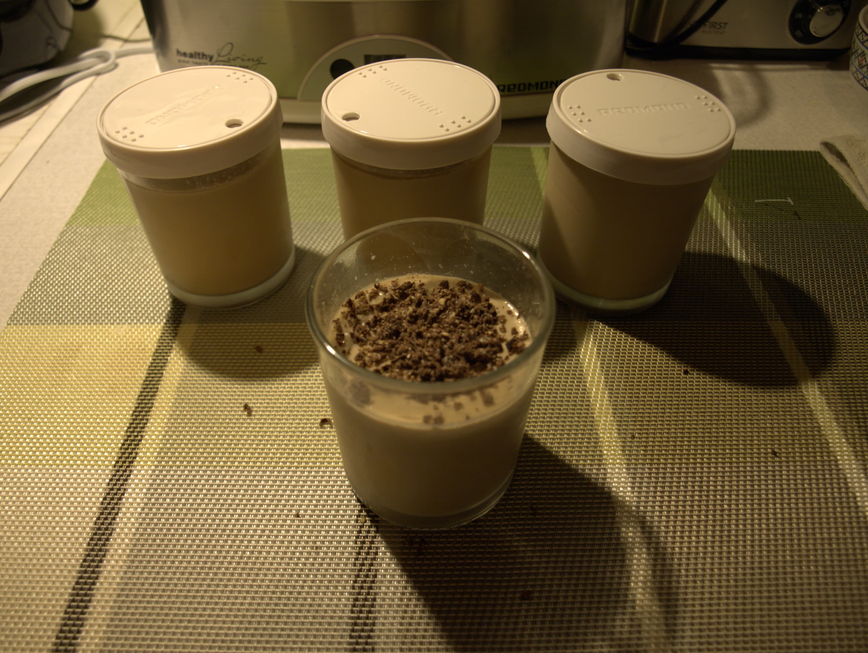 Берем литр молока, 20 г растворимого кофе, 3 г сухой закваски и 100 г сахара. Молоко доводим до кипения, осторожно помешивая. Затем даем ему остыть до комнатной температуры, добавляем закваску. Включаем йогуртницу на 10 часов. В приготовленное добавляем сахар (не очень удобно это делать порционно, примерно по ложке на баночку), тщательно перемешиваем и ставим загустеть в холодильник на 3 часа. Украшаем тертым шоколадом.