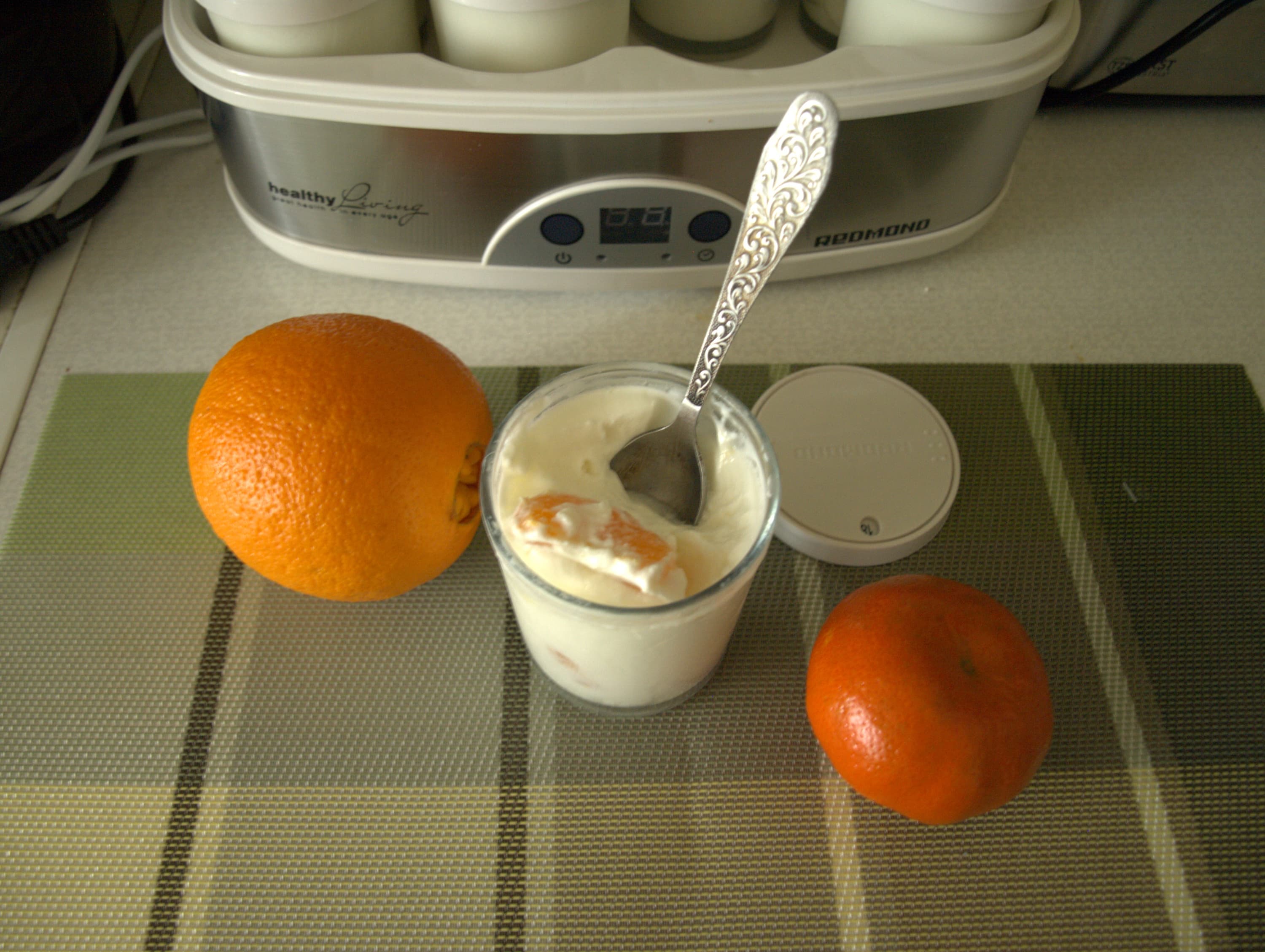 Нам понадобилось молоко (1,5 литра), пакет сухой закваски (1 г), мандарины и апельсин. Дольки цитрусовых выложили в банки. В отдельную емкость высыпали сухую закваску, постепенно добавили нагретое молоко, тщательно размешали, разлили смесь по баночкам. Йогуртницу запустили на 8 часов, готовый йогурт поставили в холодильник на 3 часа. Сластены могут добавить перед этим немного сахара. На выходе получился нежный йогурт с резкой сладостью цитрусовых. Поторопились употребить, он вышел жидковатым.