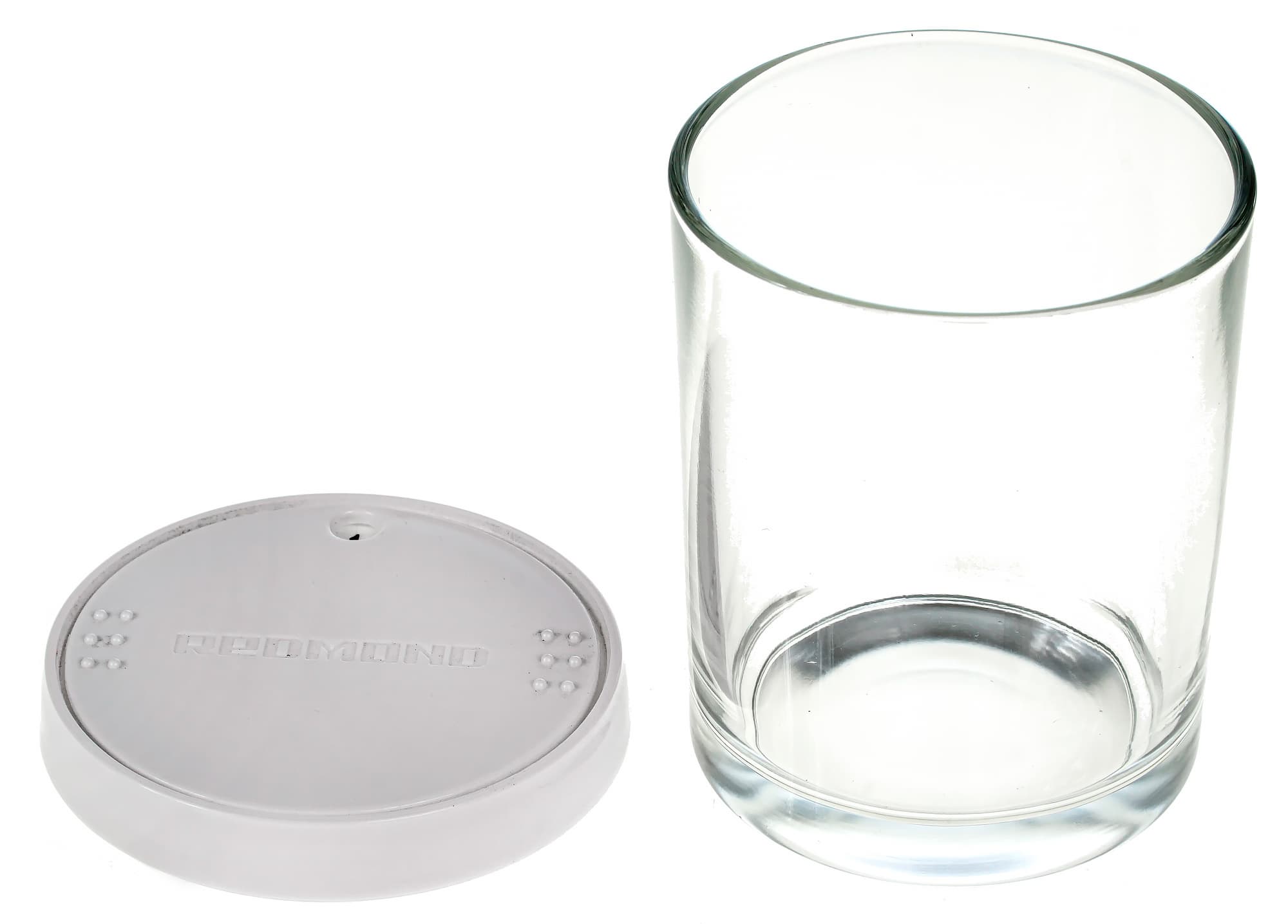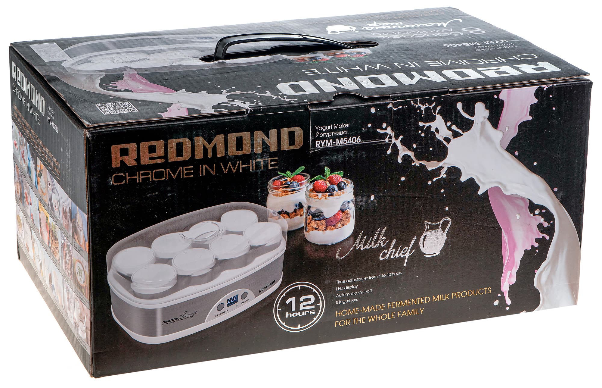 Йогуртница пришла на тесты в аккуратной, небольшой, картонной коробке с ручкой. Коробка стандартного дизайна Redmond — красочные фотографии, черный фон, белый и серебряный шрифт. Устройство защищено амортизирующей пенопластовой вставкой, а находящиеся внутри него баночки — картонными вставками.