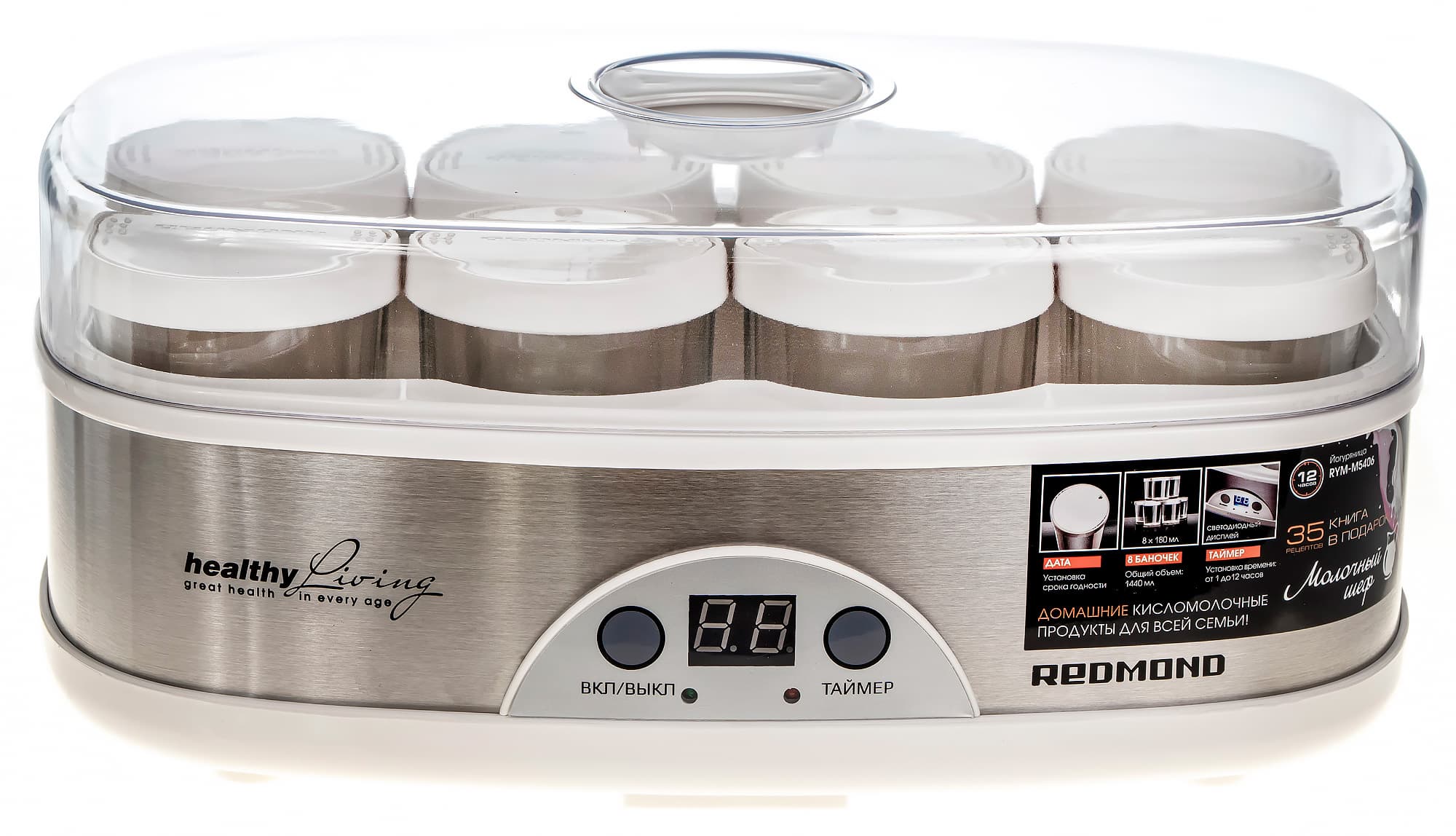 Йогуртница Redmond RYM-M5406 — простой и надежный кухонный прибор. Она будет несомненно полезна тем, кто любит кисломолочные продукты или кулинарные эксперименты. Она может существенно сэкономить бюджет родителей, чьи дети употребляют большое количество йогурта и сметаны, так как продукт получается значительно дешевле покупного. И конечно, если использовать качественное исходное сырье, значительно более полезным, без лишних ингредиентов, сахара и загустителей.