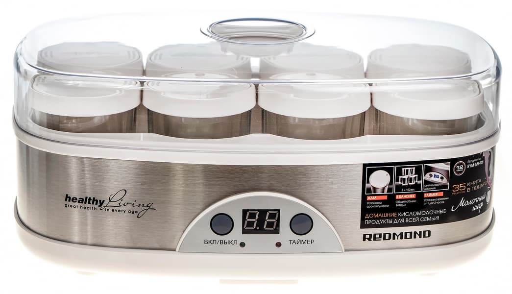 Йогуртница — достаточно простой кухонный прибор, задача которого состоит в поддержании температуры внутри устройства в течение заданного времени. Казалось бы: что может быть проще и что тут изучать? Но, как всегда, дело в деталях. Модель Redmond RYM-M5406 продумана и надежна. За счет использования 8 баночек она расширяет возможности эксплуатации, но крайне простое управление не позволяет самостоятельно выбрать температурный режим или отложить старт.