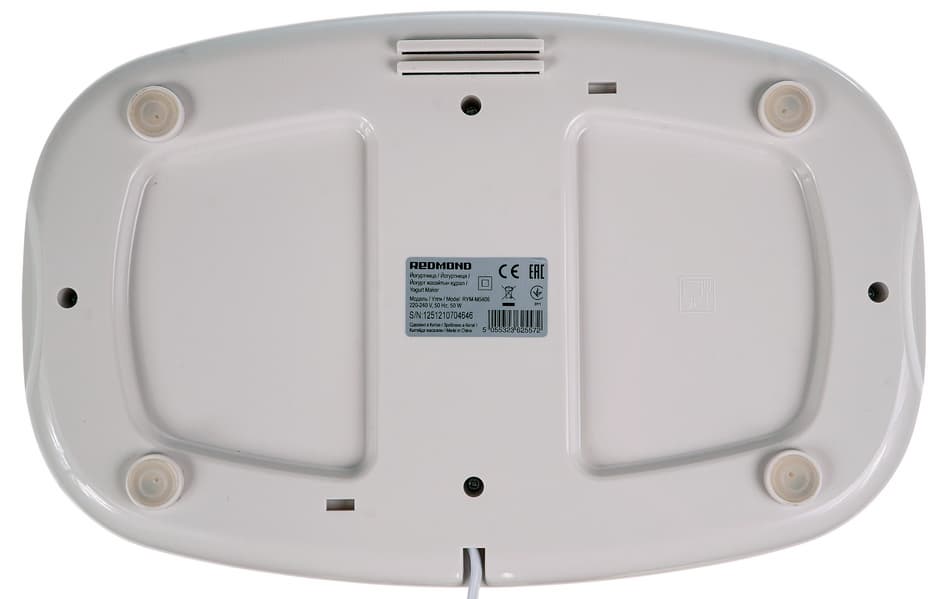 Стоит йогуртница на маленьких ножках. Отсек для шнура не предусмотрен, но шнур небольшого сечения, поэтому не сильно мешает на кухонном столе.