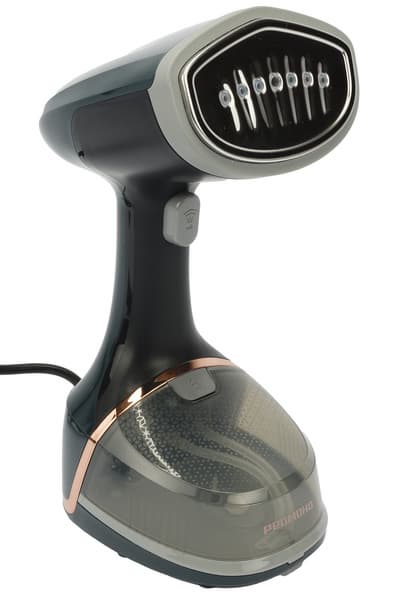 Корпус отпаривателя выполнен из темно-зеленого пластика, как производитель романтично называет его — темно-малахитового, с небольшим количеством пластиковых вставок золотистого, черного и серого цветов.