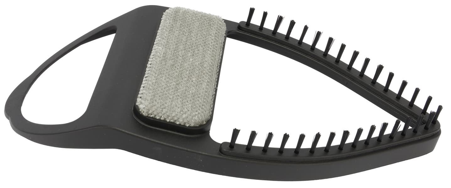 Щетка-насадка не очень легко устанавливается на утюжок, но прочно фиксируется и эффективно собирает пыль и мелкие загрязнения с ткани. Одновременно пар приподнимает ворс, что позволяет всего за пару минут очистить и освежить вещь. Все загрязнения остаются на щетине и легко удаляются влажной рукой.
