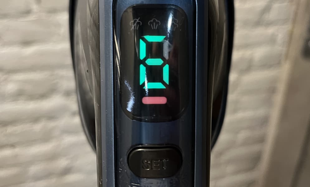 Далее нажимаем кнопку включения и ждем пока прибор выйдет на рабочую температуру. На это у него уходит 16 секунд (по инструкции 25). Индикатор режима работы продолжает непрерывно гореть красным цветом, а на дисплее начинается обратный отсчет от цифры 9. Как только достигнута цифра 0 — можно приступать к отпариванию.