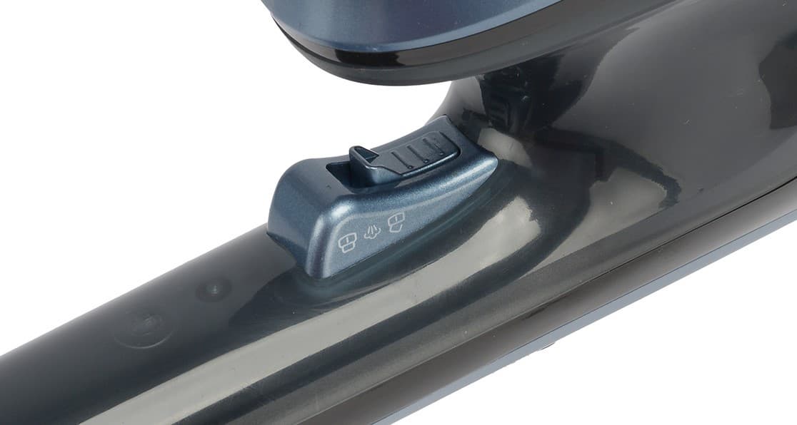Кнопка подачи пара находится под ручкой снизу и может нажиматься как краткосрочно для выхода небольшого количества пара, так и зажиматься для постоянной подачи пара. Для удобства производитель добавил механический фиксатор — если потянуть его на себя при нажатой кнопке, положение кнопки зафиксируется и пользователю не придется удерживать ее самостоятельно.