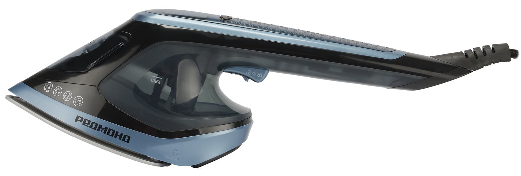 Корпус отпаривателя выполнен из черного и синего пластика. Он имеет нестандартную вытянутую форму за счет значительно удлиненной ручки. Стоять на подошве прибор не может, так как центр тяжести у него смещен в сторону ручки (и даже наполненный резервуар с водой этого не меняет). Его устойчивое положение — две точки опоры — скошенная грань за подошвой и пластиковая ножка в конце ручки, над которой выходит шнур электропитания. Благодаря такому решению прибор во время работы можно будет без опаски опустить на любую рабочую поверхность — подошва к ней прислониться не сможет.