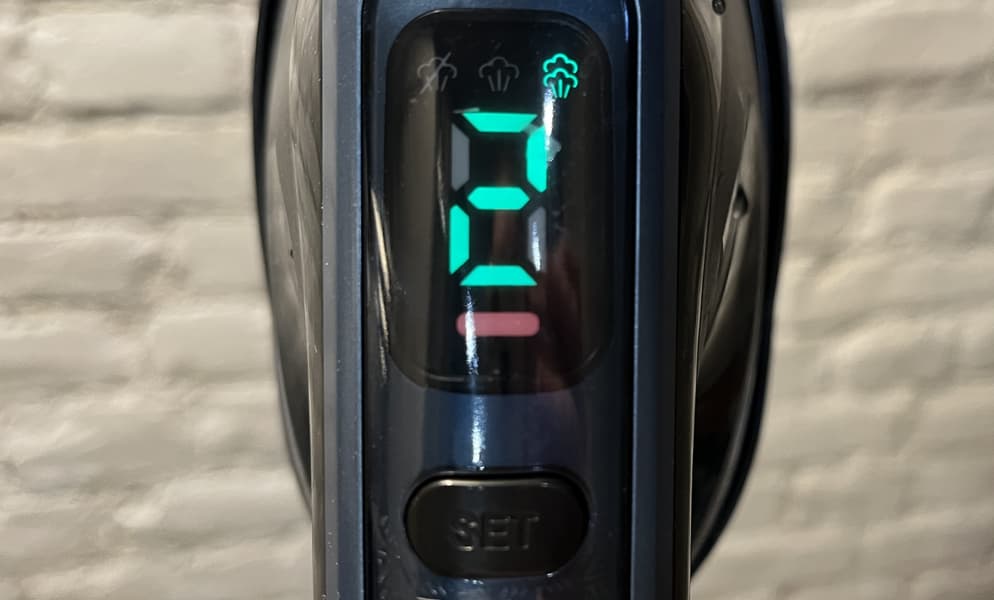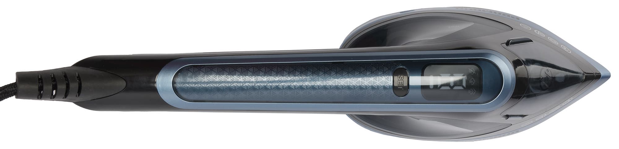 Помимо нуля над дисплеем загорается индикатор текущего активного режима работы. Всего их три: глажение без пара, легкое отпаривание и режим максимальной подачи пара.